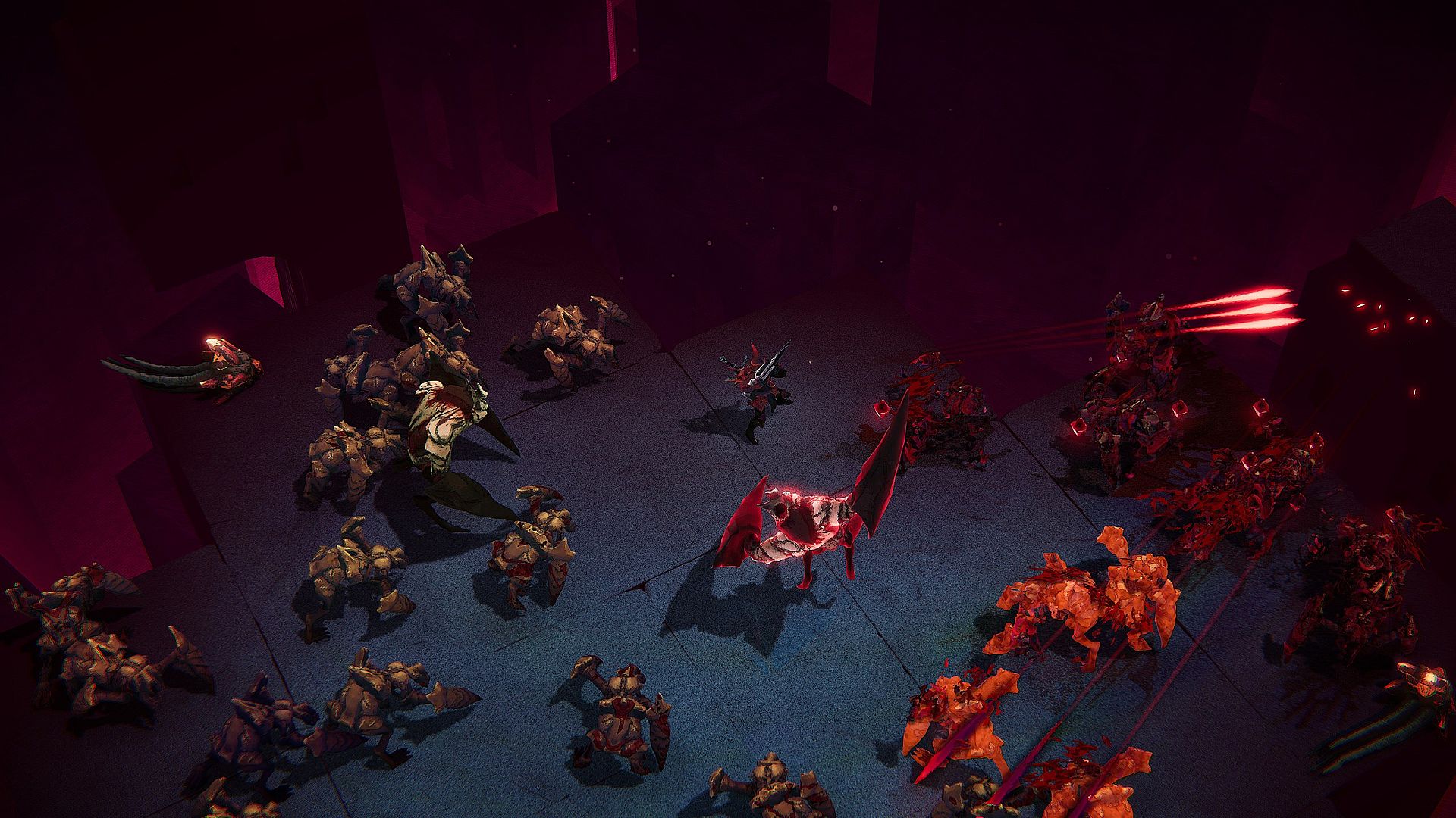- Fast and visceral top-down, push forward combat that rewards aggression and precision