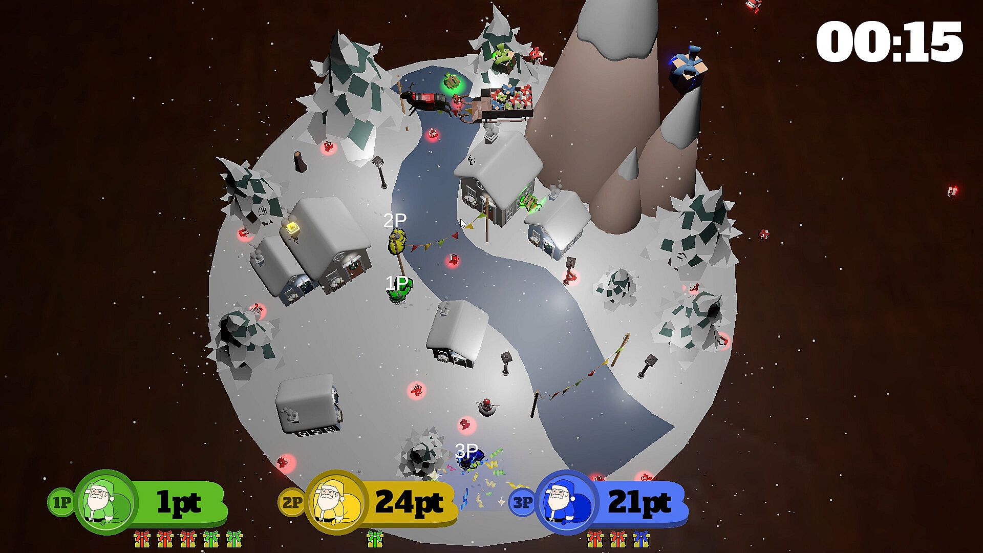 When the time runs out, the player with the highest score wins the match and earns the title of “King of Santa.”