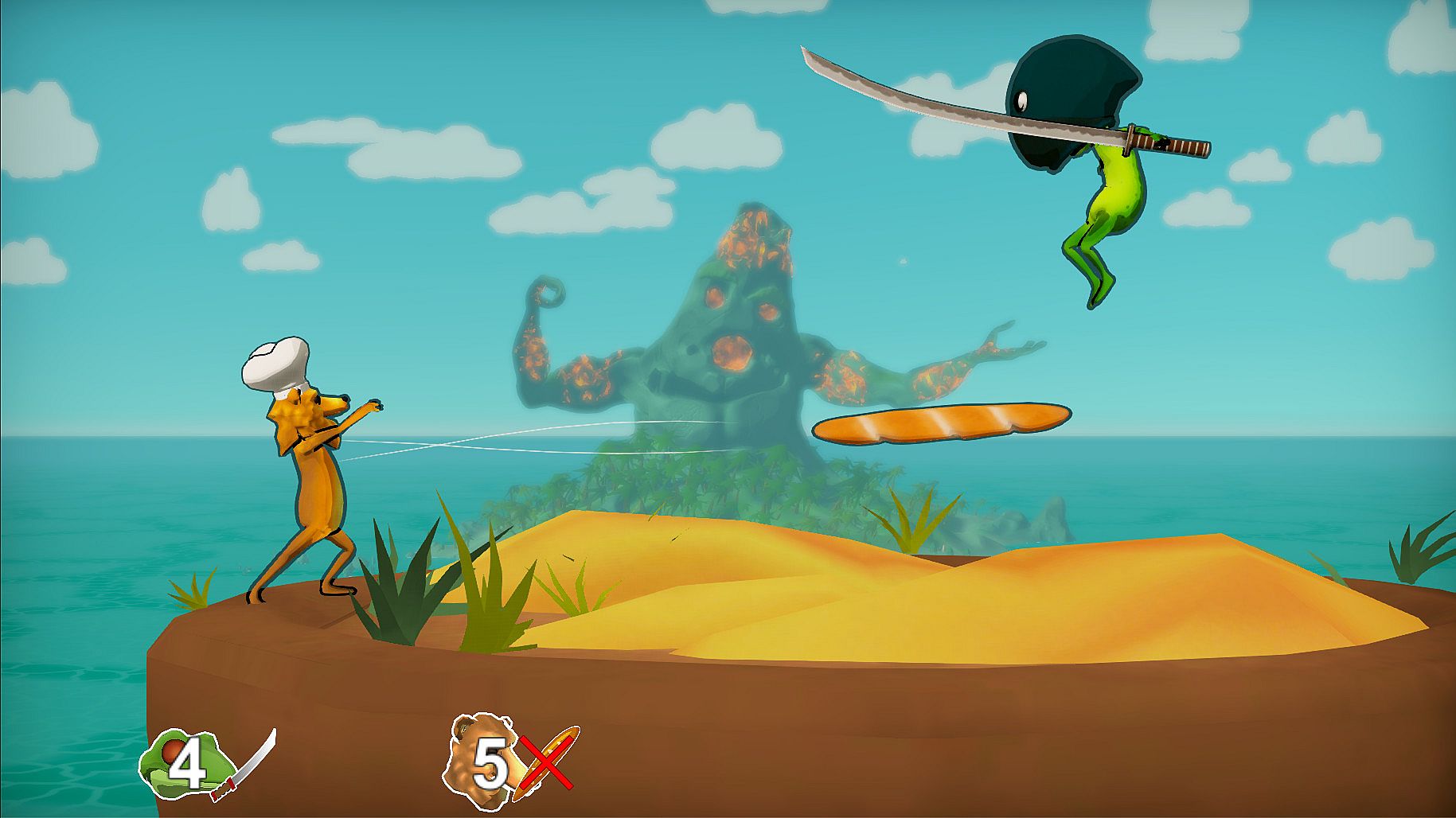 Nature tests survival through brutal battles among adapted creatures. Players control bears, fish, frogs, chickens, penguins, toothless T-rexes, or sewing ladies in chaotic versus matches. They wield nature-inspired tools like black hole guns and chug baguettes amid erupting volcanoes or rampaging cheese wheels.
