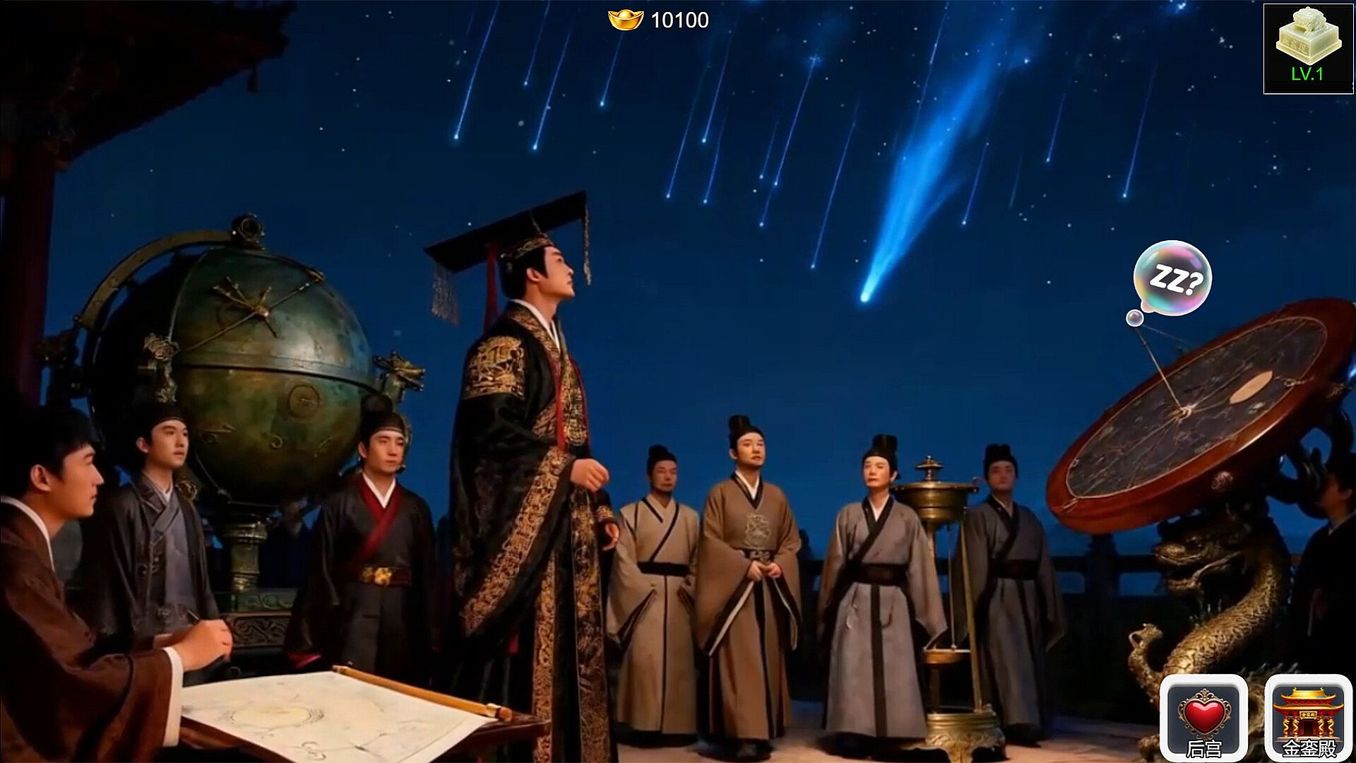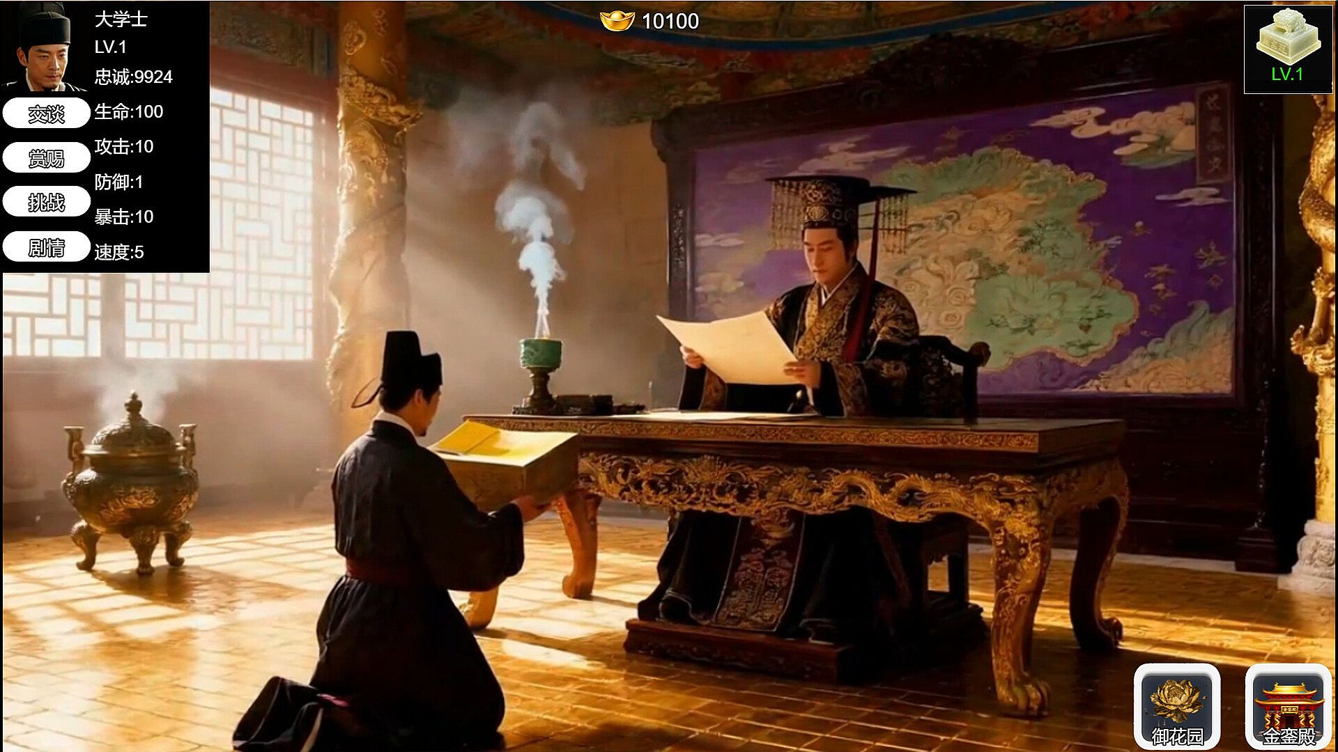 Players take on the role of an ancient emperor, traveling back and forth between the Golden Luang Hall, Zhonghe Hall, Imperial Garden, Qintian Temple, and the imperial harem.