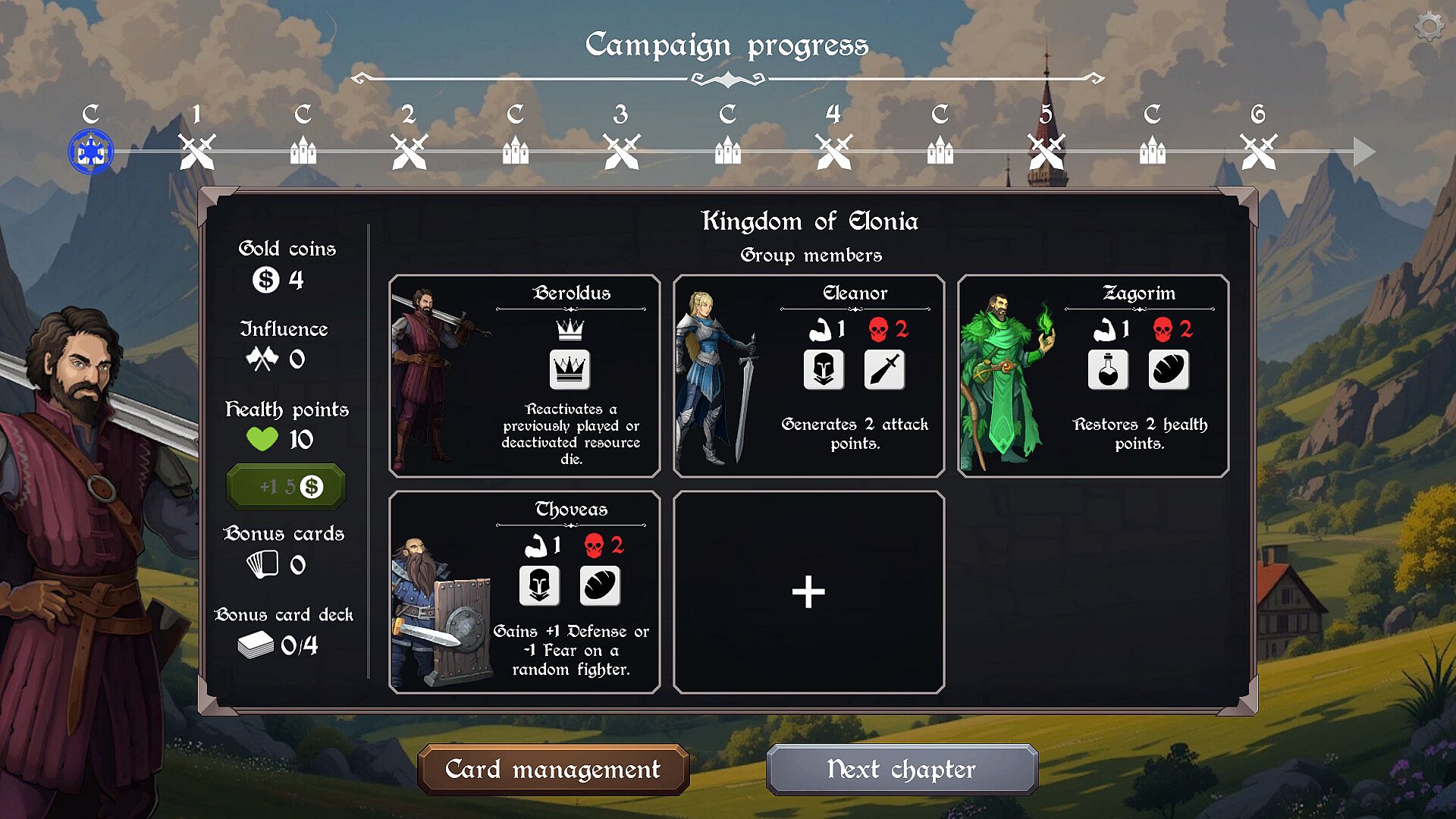 Before each new chapter, you can strengthen your group of fighters to become increasingly powerful. Level them up, recruit new warriors, purchase bonus cards with various powers, and more.