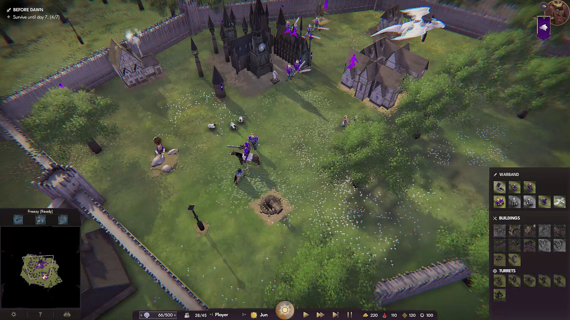 Manage your resources carefully and efficiently. Be careful of the changing weather conditions. Get ready to defend your village every night!