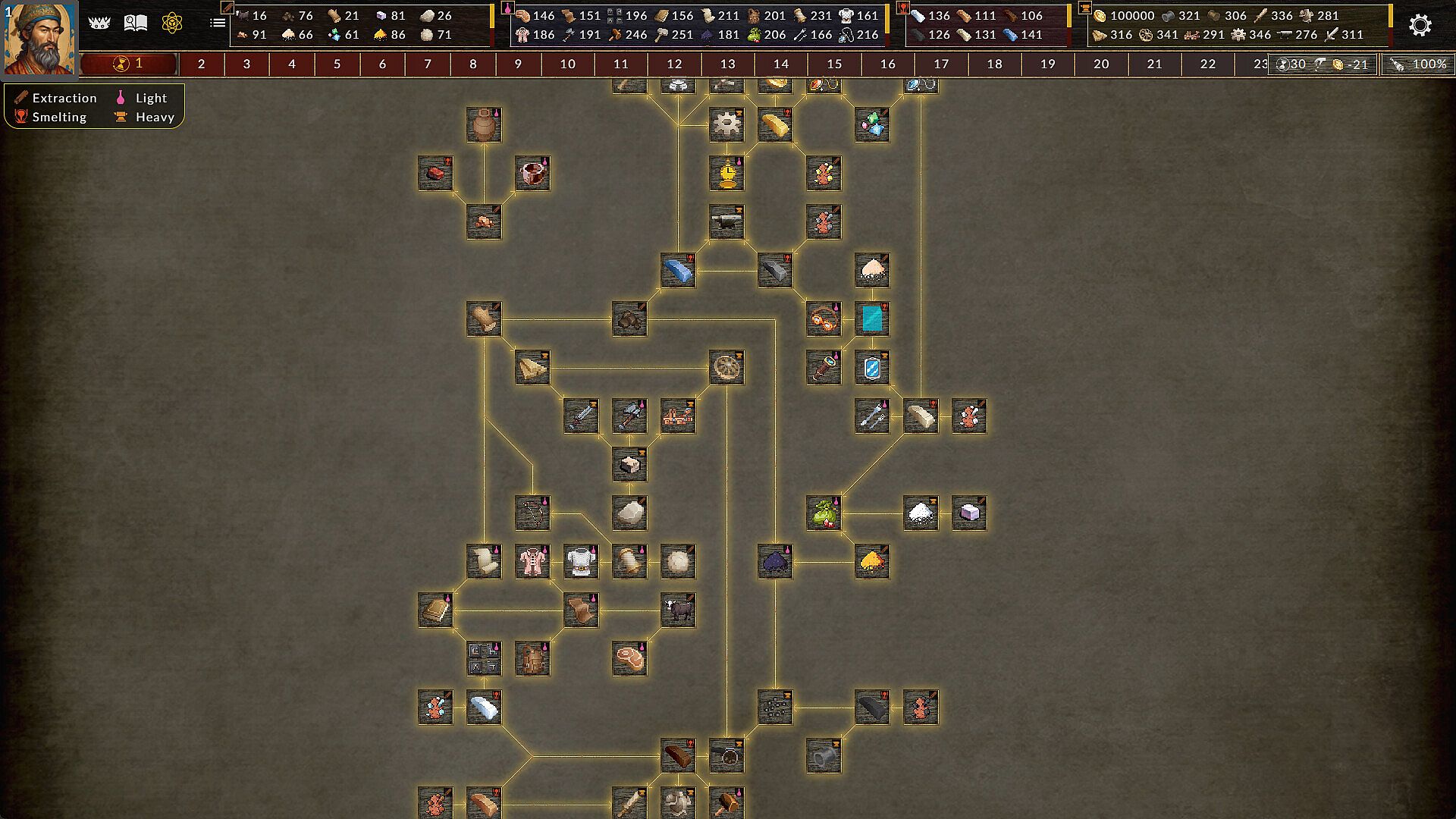 A complex crafting tree. Plan your strategy to make the most of the opportunities the game offers. Will you forge tools and weapons, or perhaps mint your own gold coins? You decide!