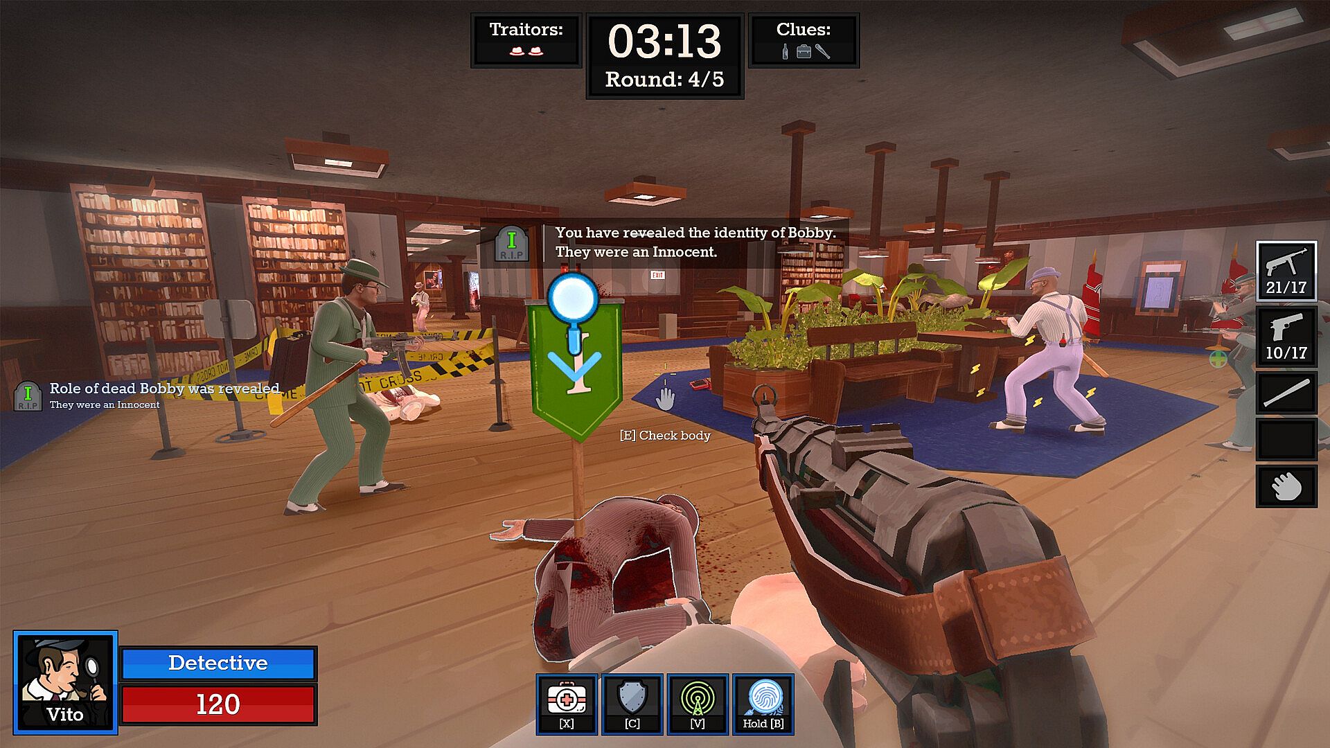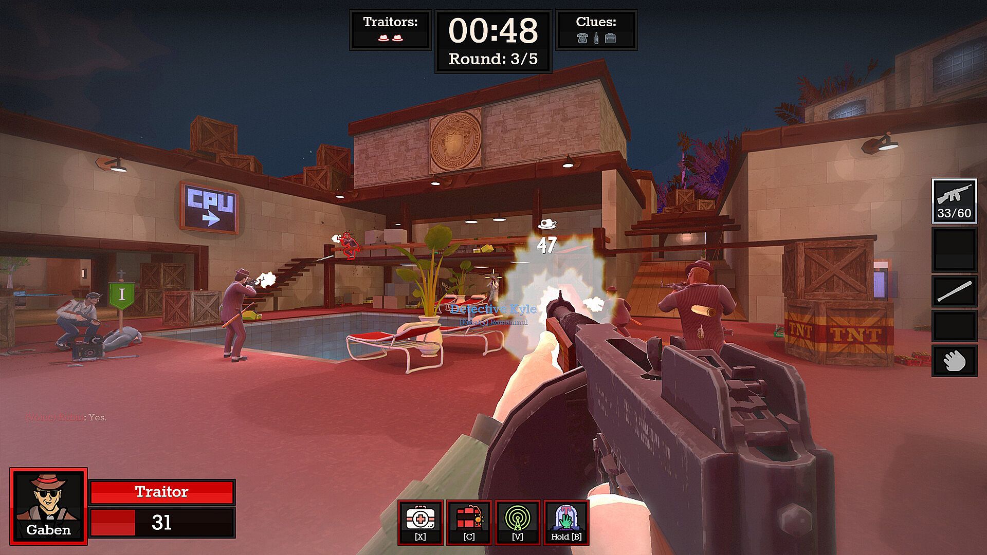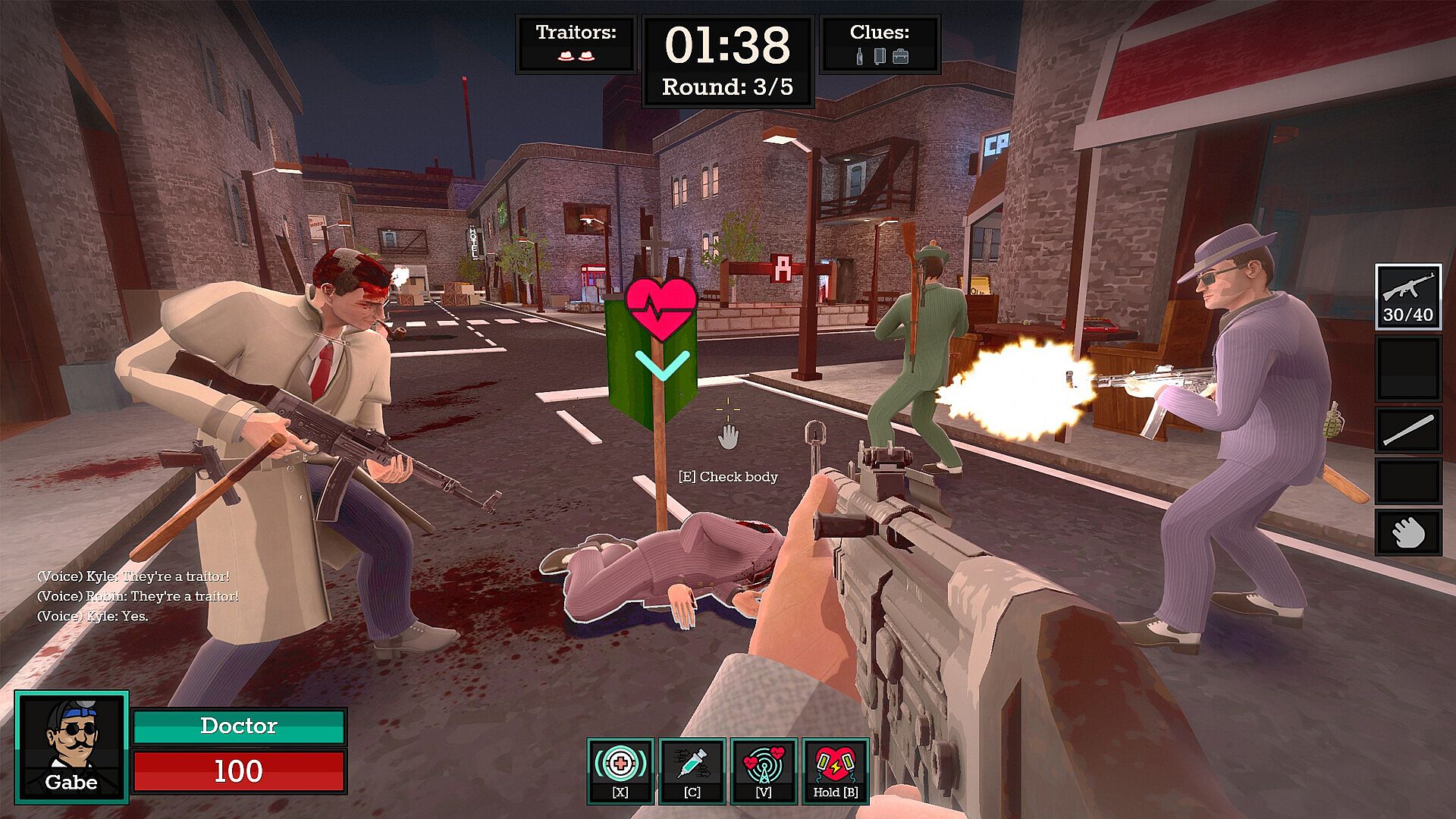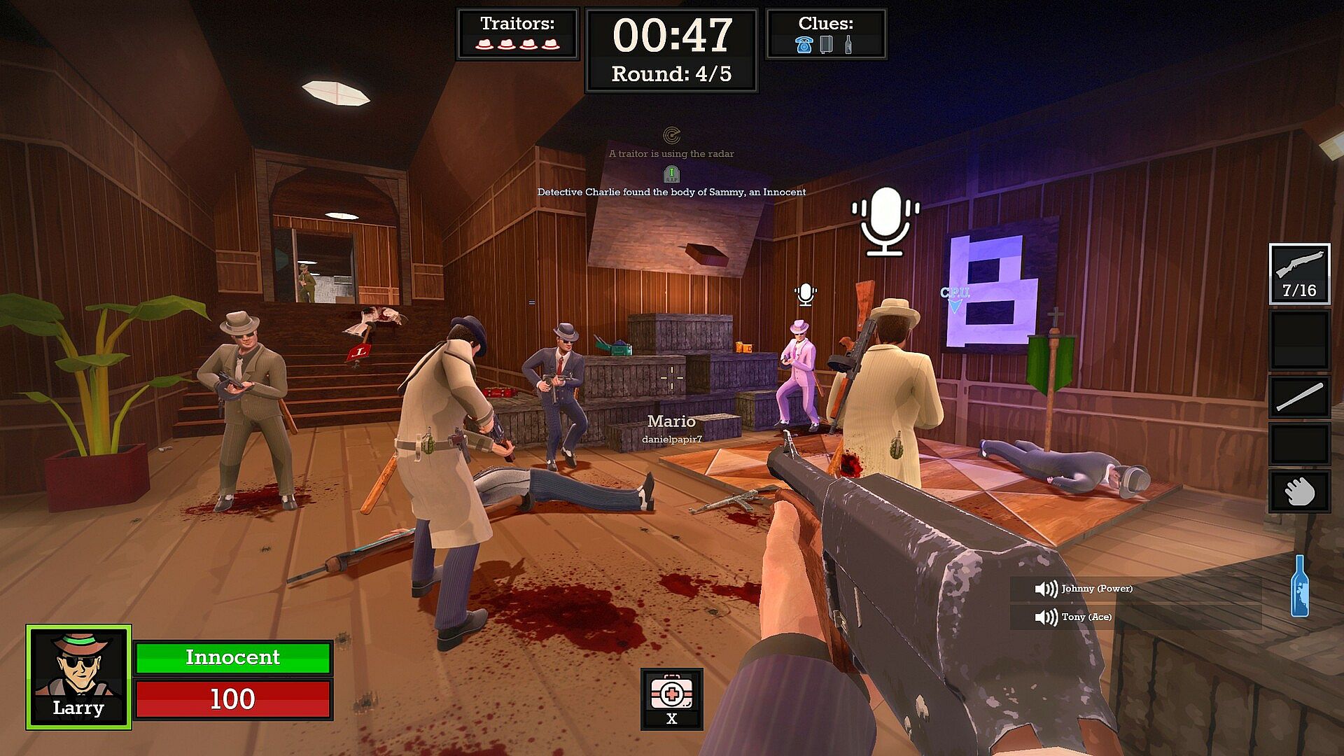 At the start of each round, the Don's body appears. When a player discovers it, Clues spawn across the map for players to collect. Delivering enough Clues to the C.P.U. reveals a Traitor. Beware: Traitors can sabotage the C.P.U. by shutting off its power supply!