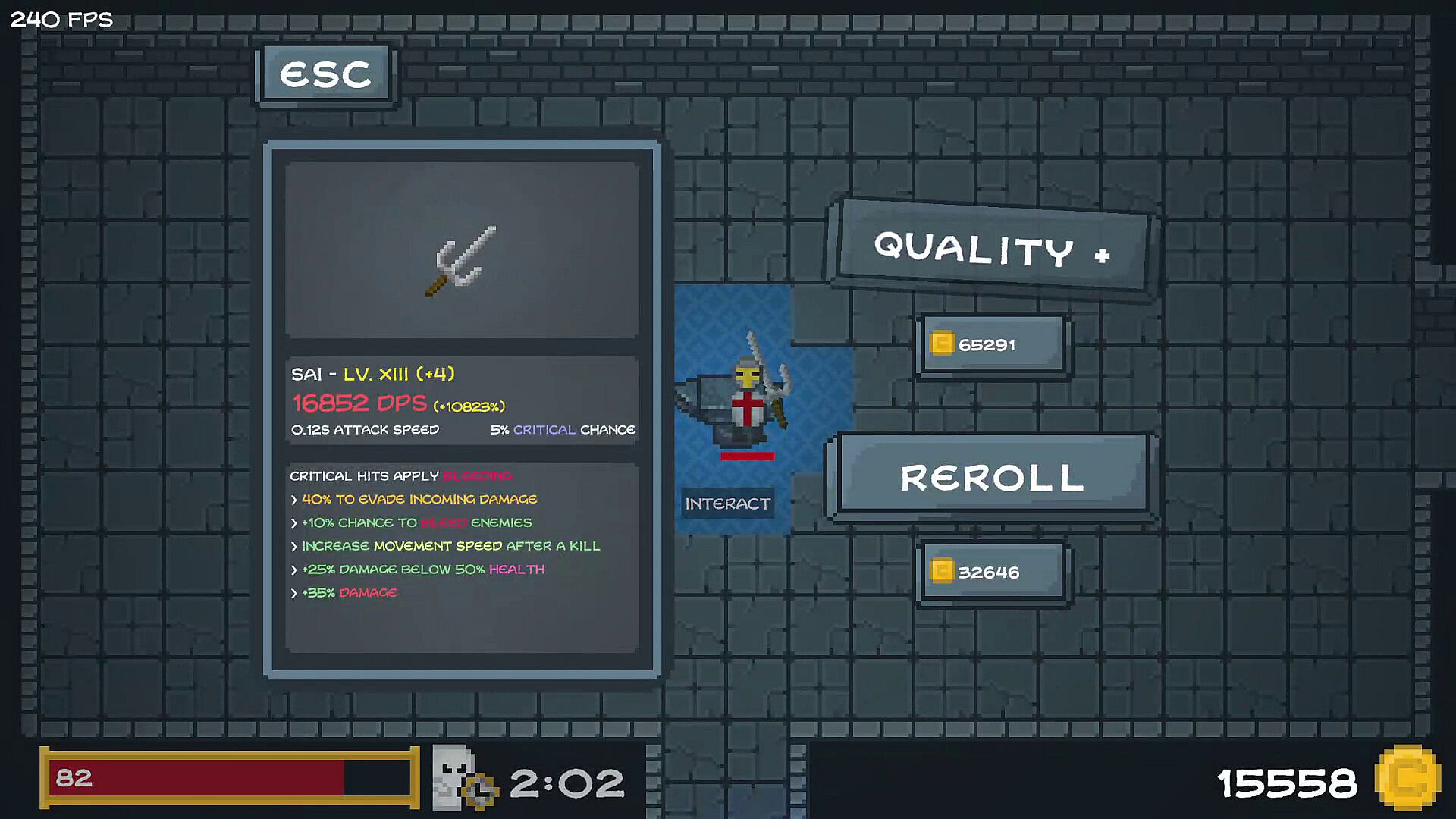 On your journey, you will encounter health potions, weapons, shops, and blacksmiths. Collect coins to purchase and upgrade your weapons. Weapons can have up to 6 modifiers, ranging from simple damage boosts to lightning, lifesteal, and legendaries.