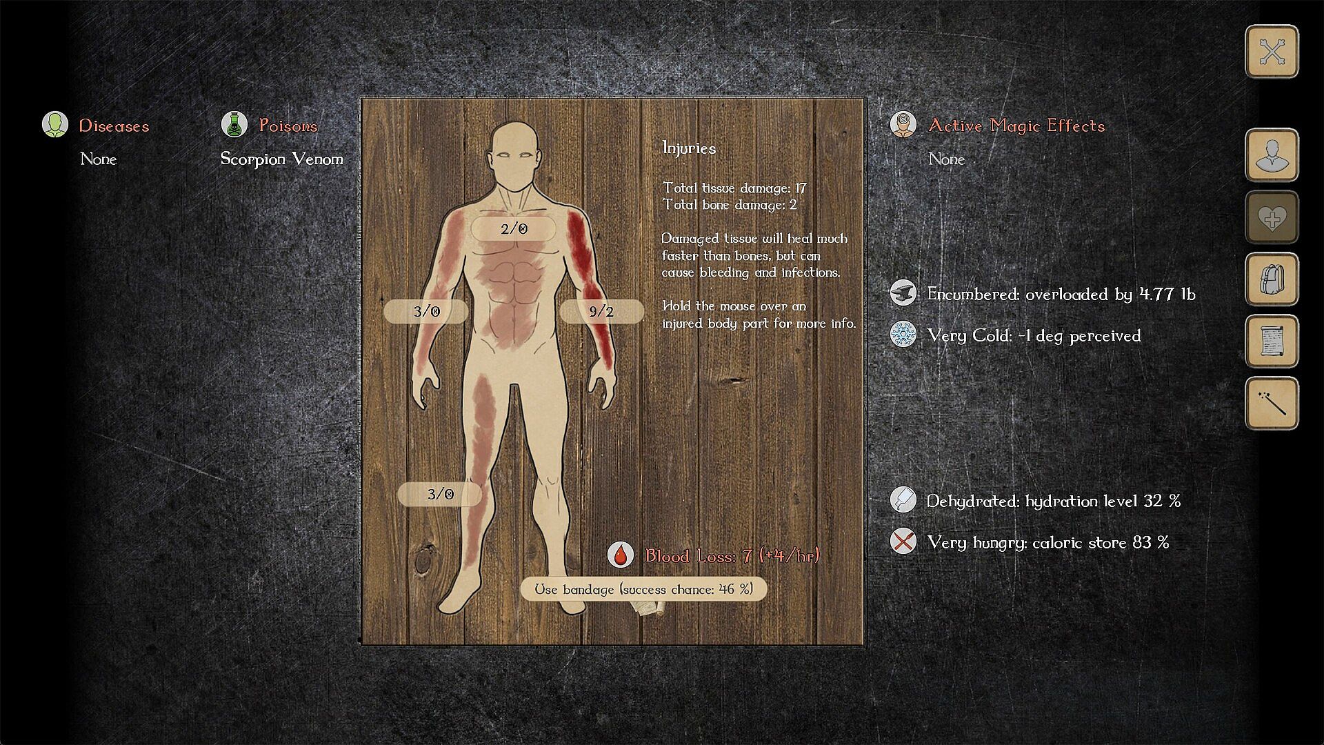 You will get hungry, thirsty, and tired. You will suffer from the heat or the cold when wearing garment that is inappropriate for the season. You can get sick, poisoned, intoxicated, encumbered, and more.