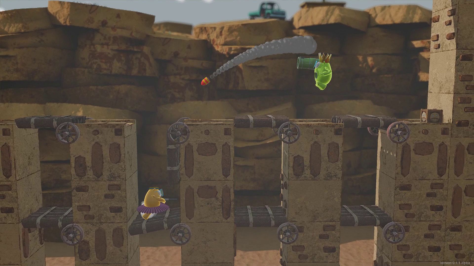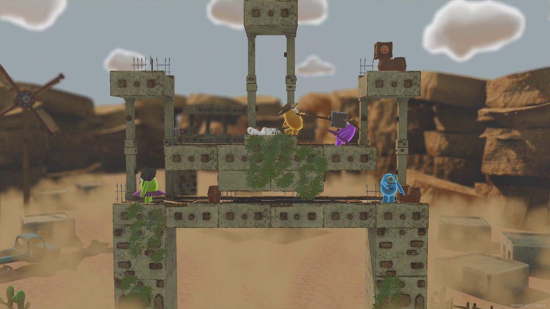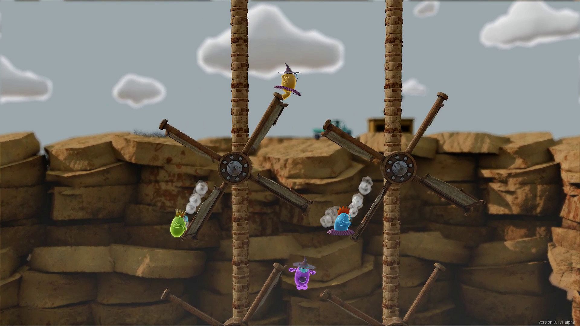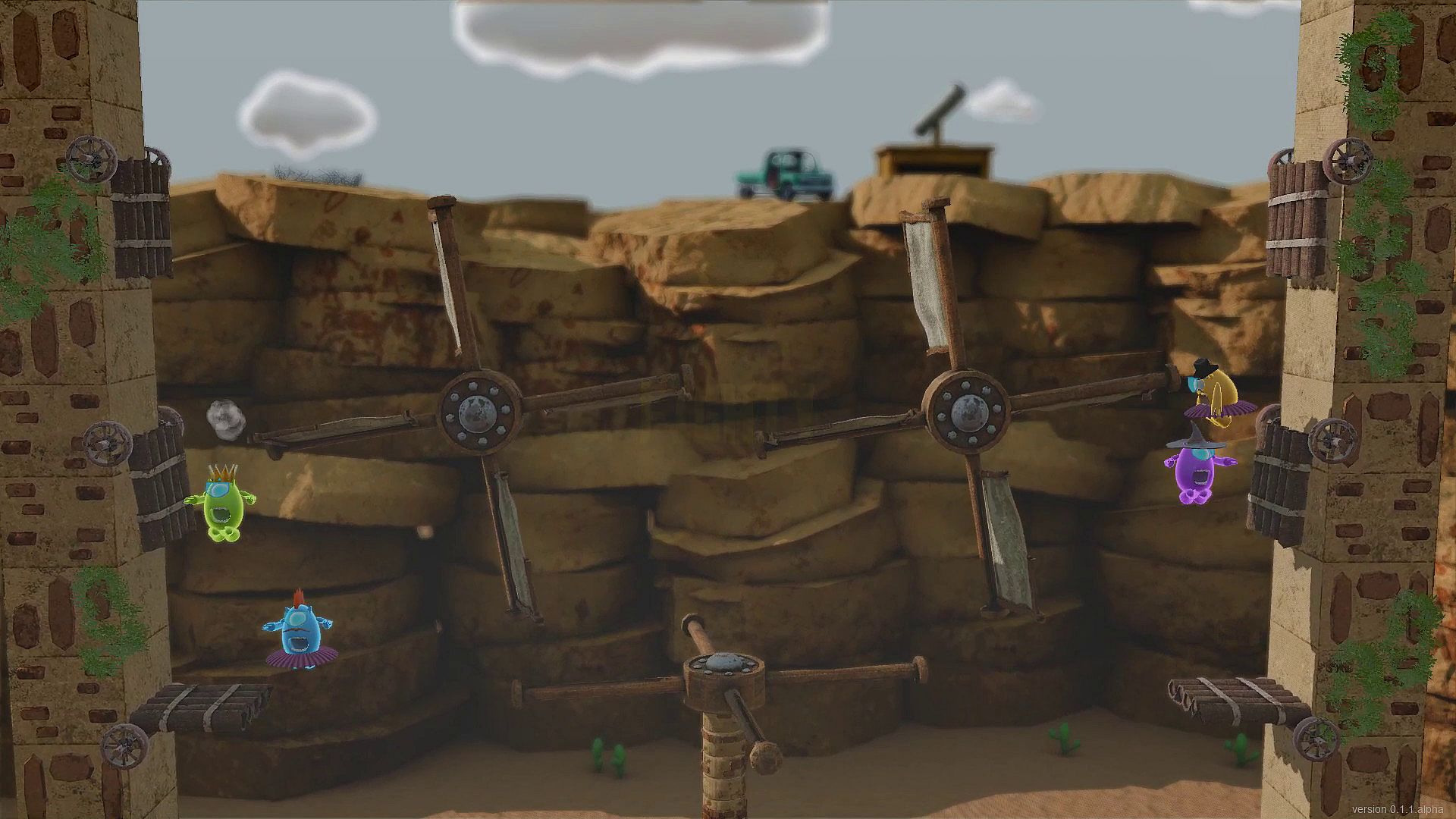 Knuckers Test Fight is a couch fighting game with funny characters, cute costumes, various weapons, tricky levels, and mini-games.