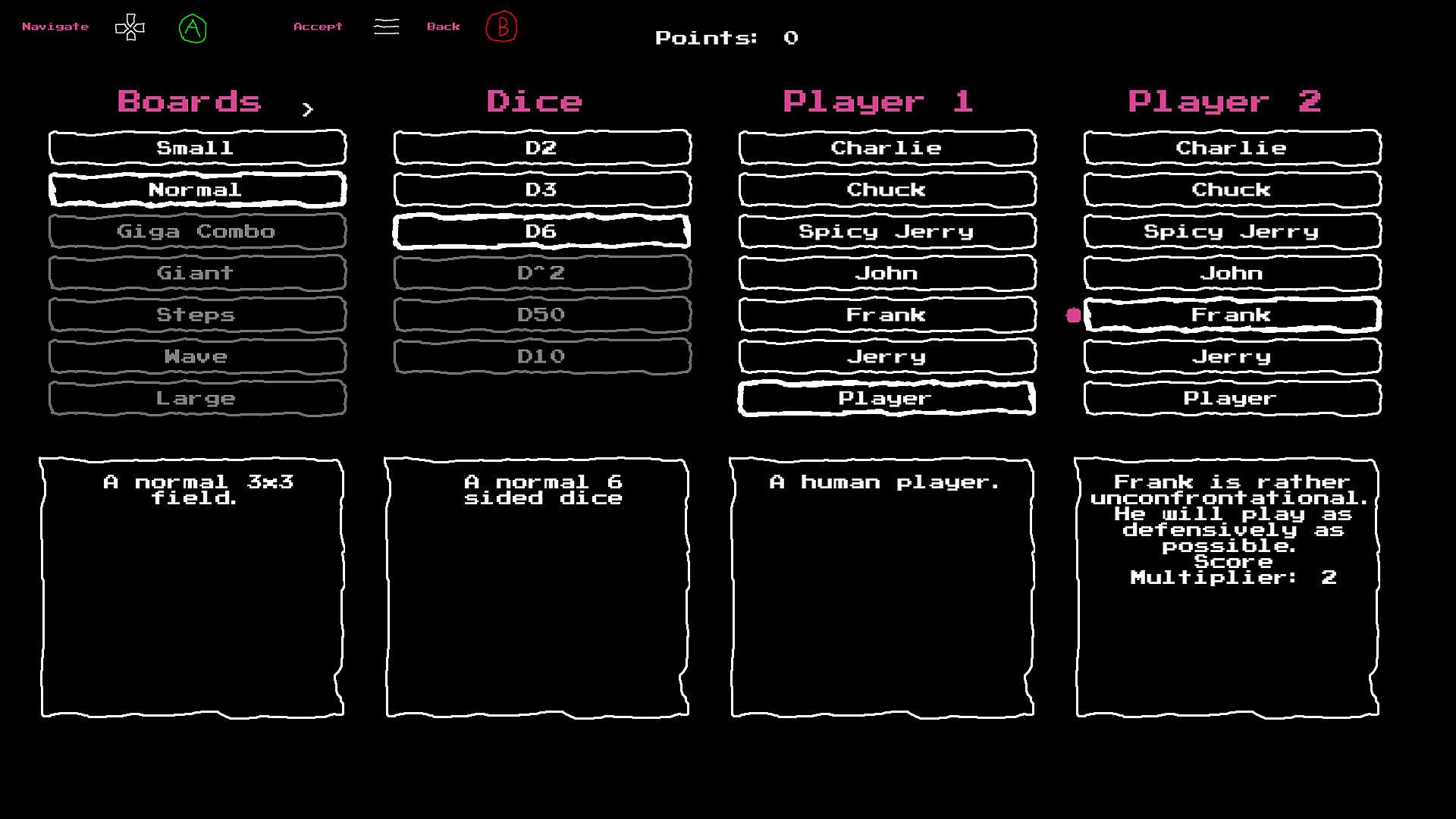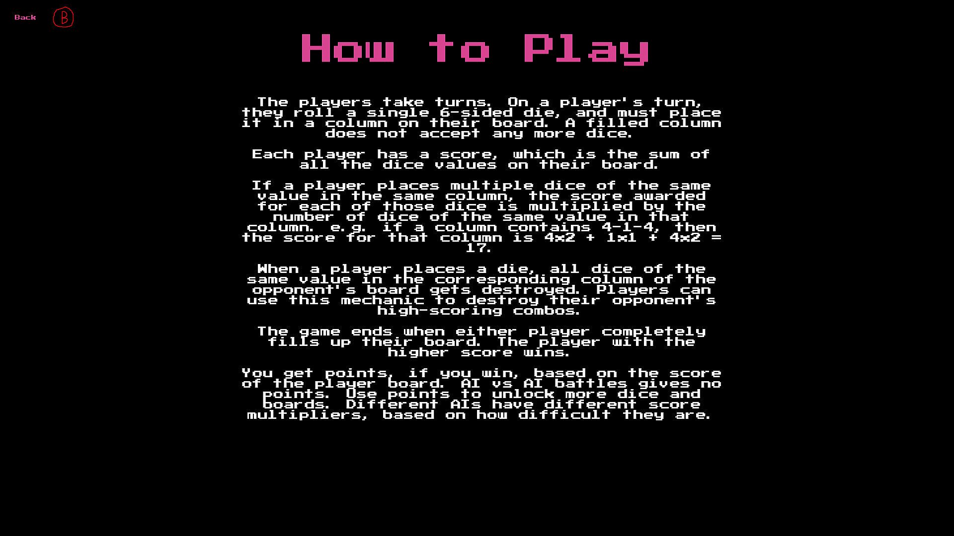 * You get points, if you win, based on the score of the player board. AI vs AI battles gives no points. Use points to unlock more dice and boards. Different AIs have different score multipliers, based on how difficult they are.