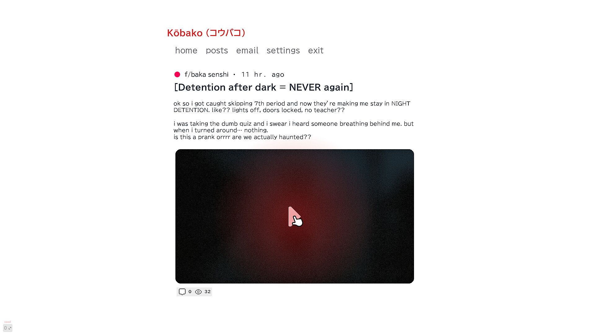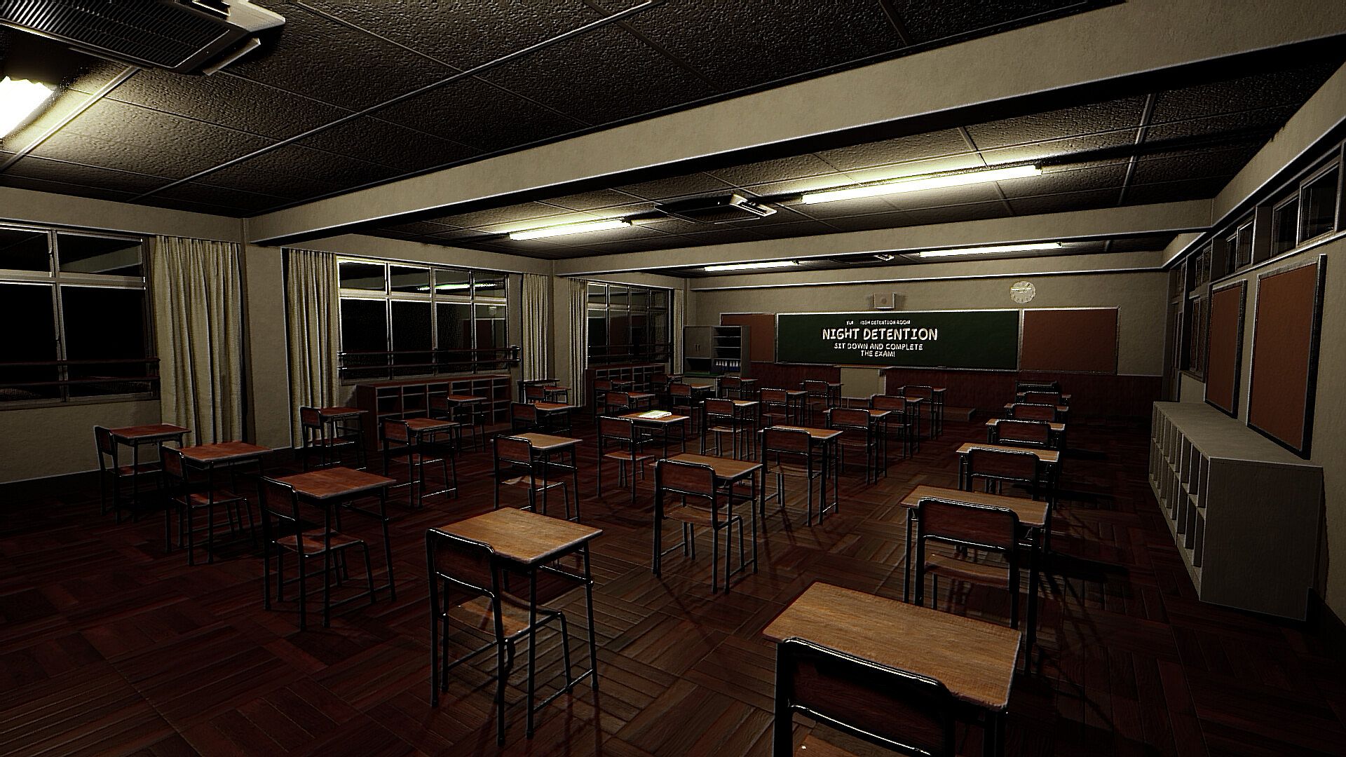 Welcome to Night Detention | 夜の居残り. A paranormal quiz survival set in the haunted school of Akabako. You're a student stuck in after-hours detention. To escape, you must survive three randomized classroom subjects, ace your tests, and dodge whatever's lurking just beyond the classroom.