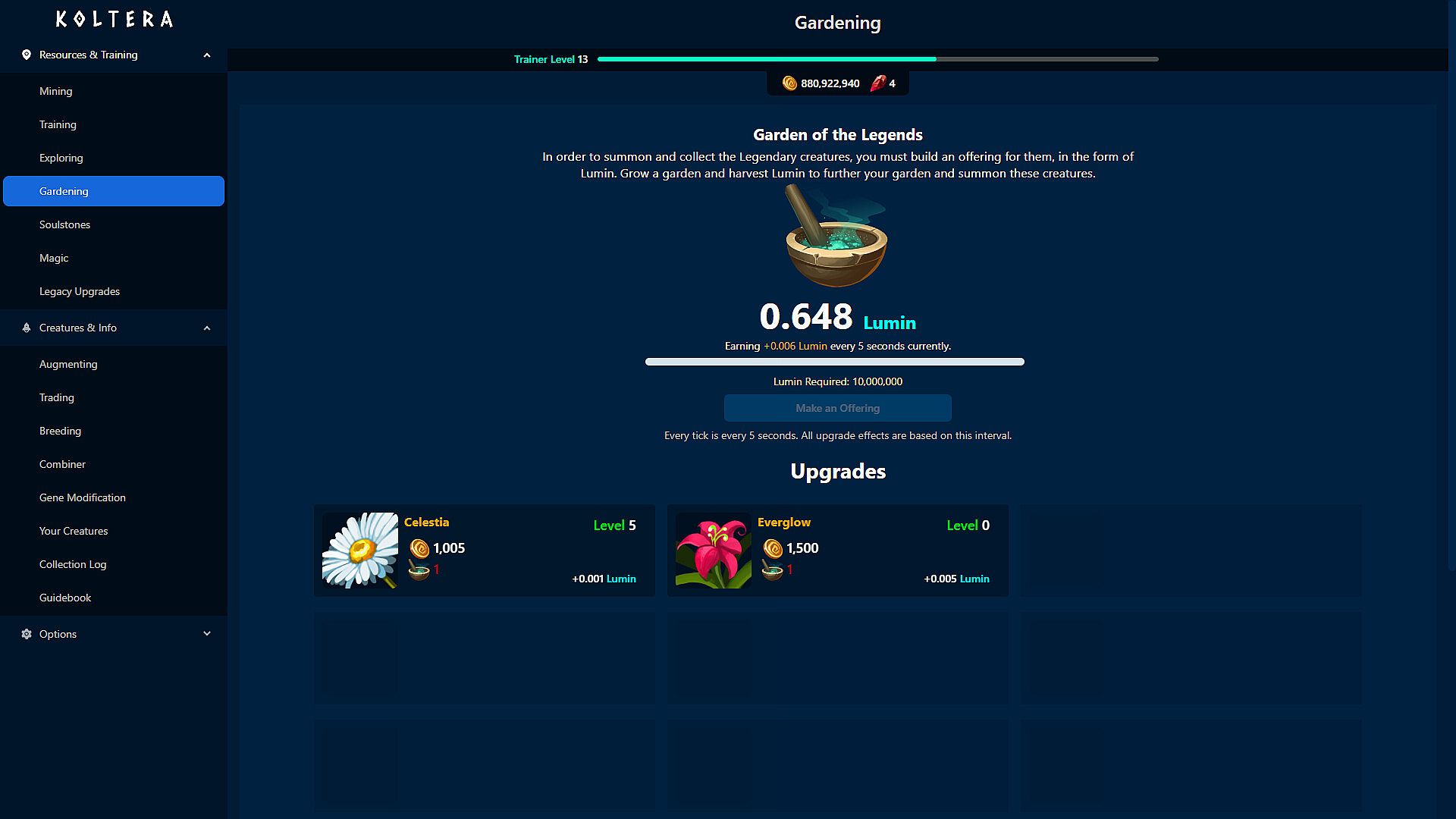 Dive into Koltera, a creature-collecting idler where you mine and train creatures to boost your output. Creatures grow stronger over time, unlocking better mining efficiency and access to new discoveries. Tinker with their unique genetics and species stats to balance and optimize performance. Collect over 450 creatures from 41 unique types, each with 11 augmented versions, while applying more than 18 upgradable effects. Breed for ideal traits, trade with merchants for rarer species, and build a garden that summons legendaries through incremental play. Earn uncapped offline progress in coins and lumin to fuel your expanding operation. Casual strategy fans who enjoy simulation idlers will find endless tinkering here.