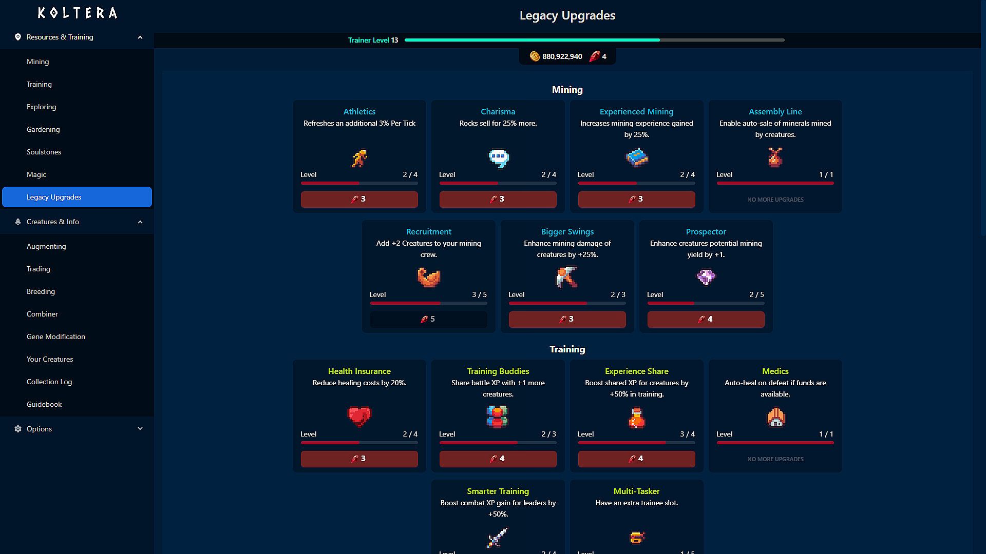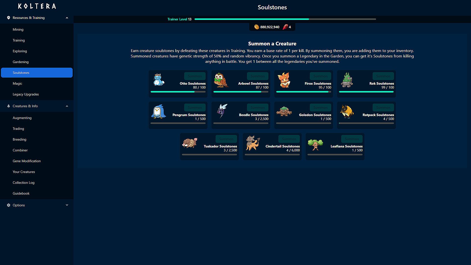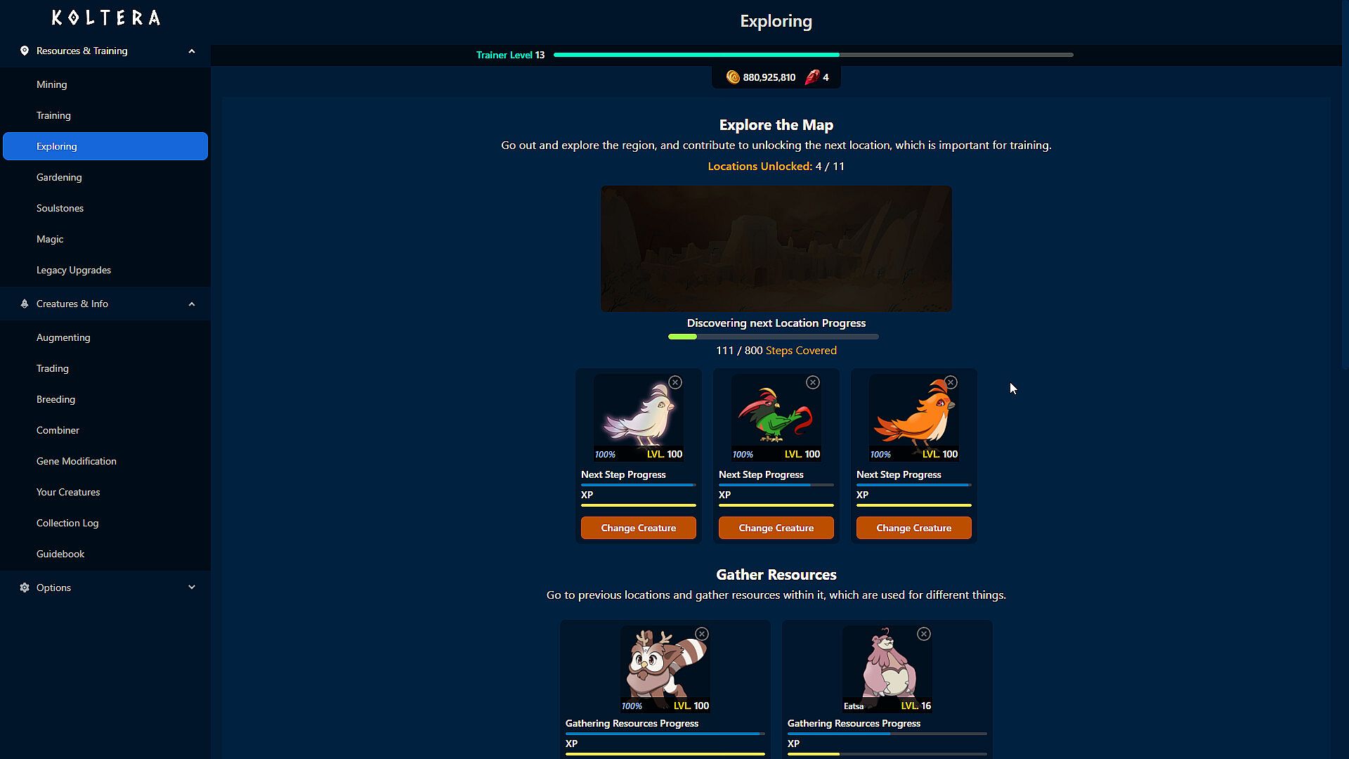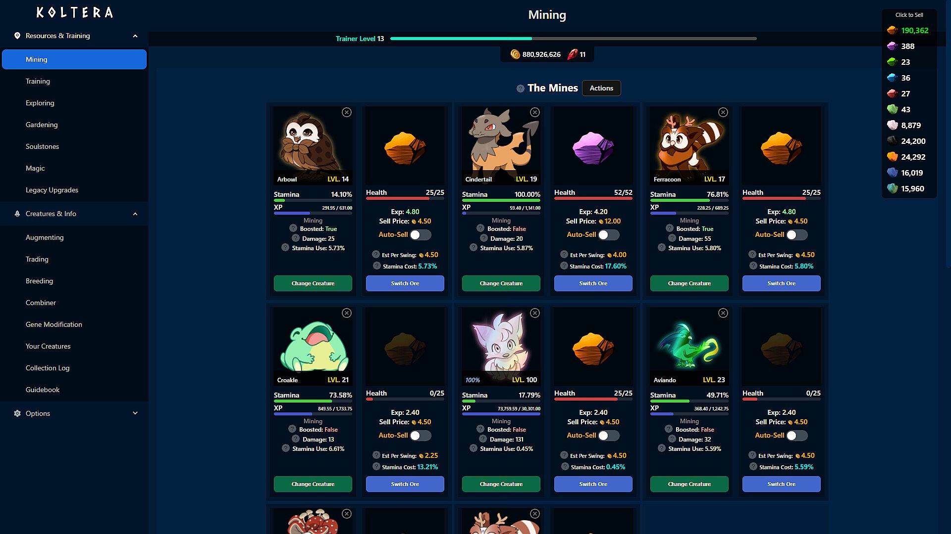 In this Creature-Collecting Idler, Koltera, you Mine and Train with creatures. As your creatures grow, they will grow stronger furthering their ability to help you. Discover upgrades that will further this output and make things easier. As your operation grows, so will your ability to discover new creatures and trade with traders. Koltera offers 41 unique creatures, each with 11 augmented versions. That's 450+ creatures to collect!