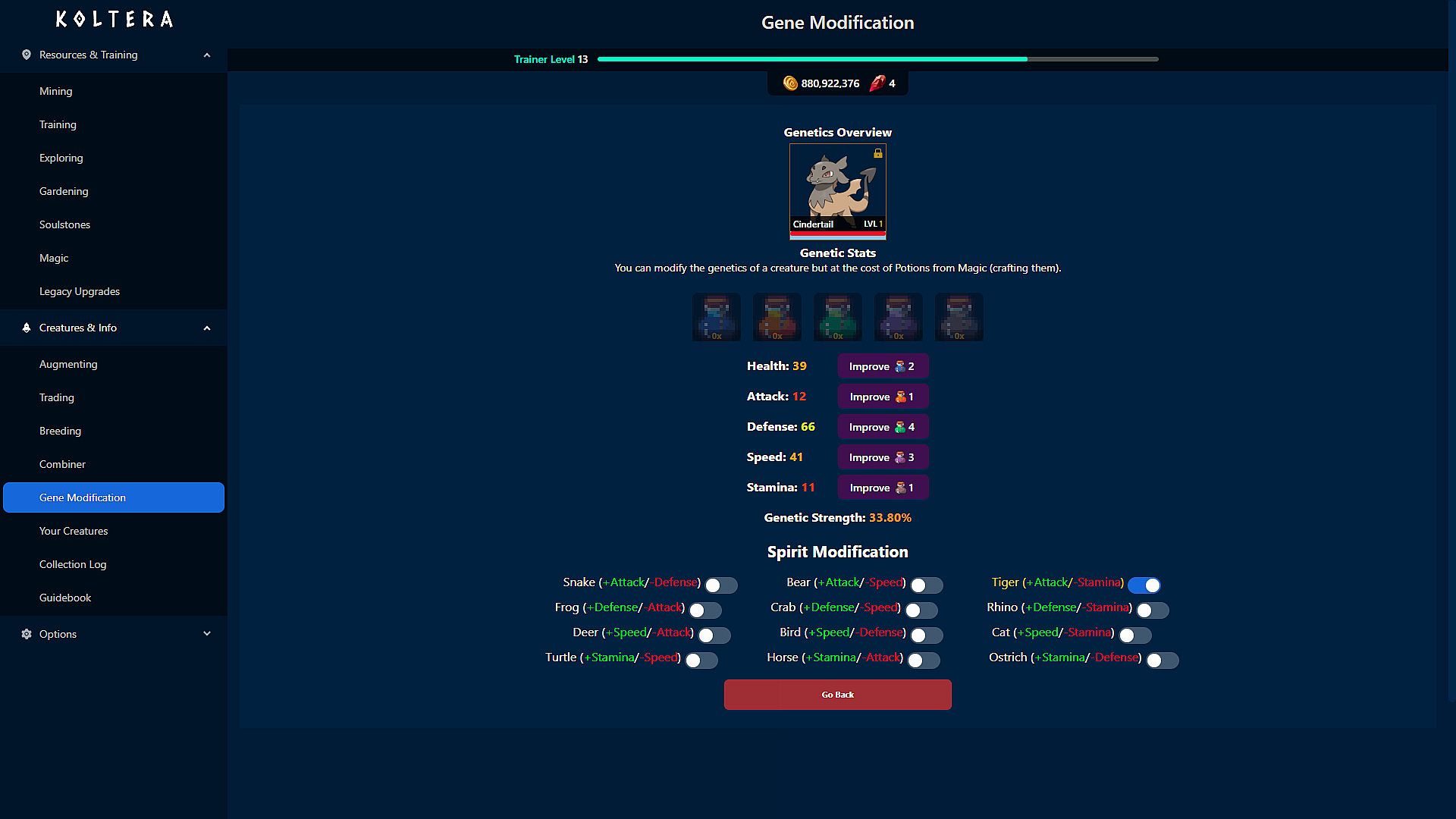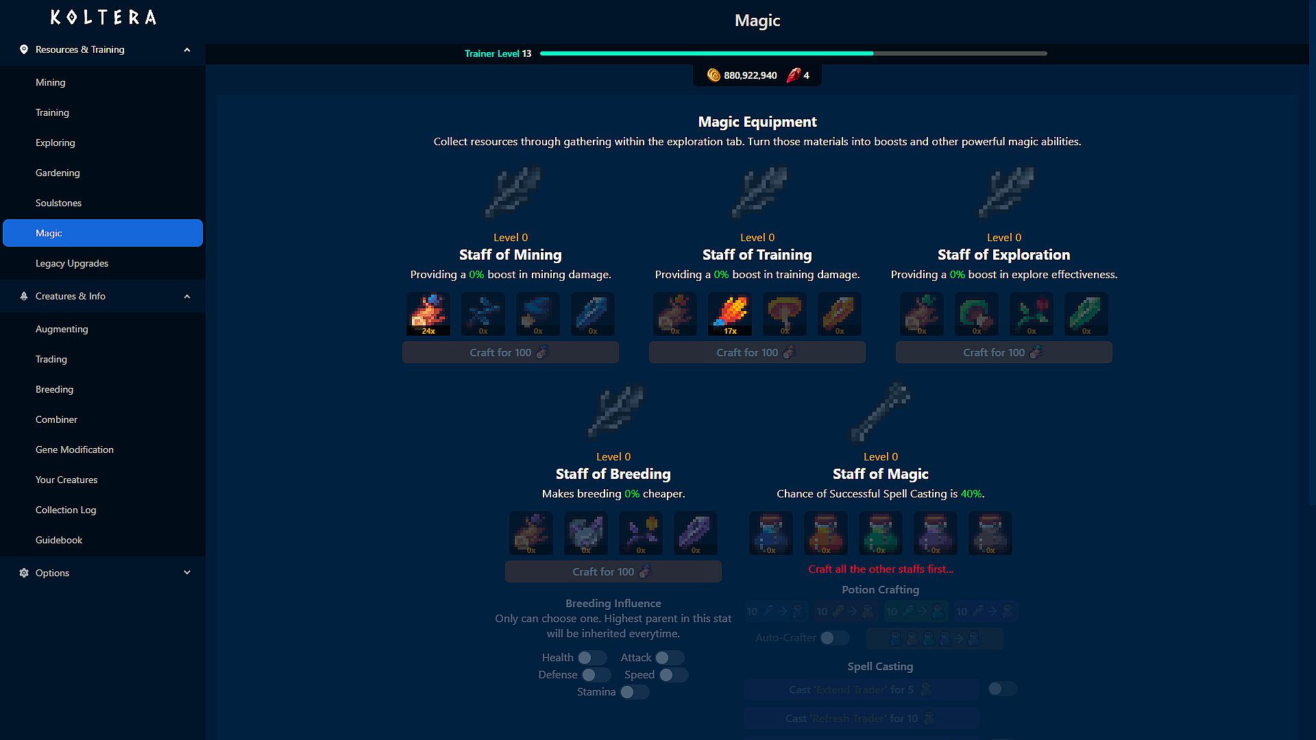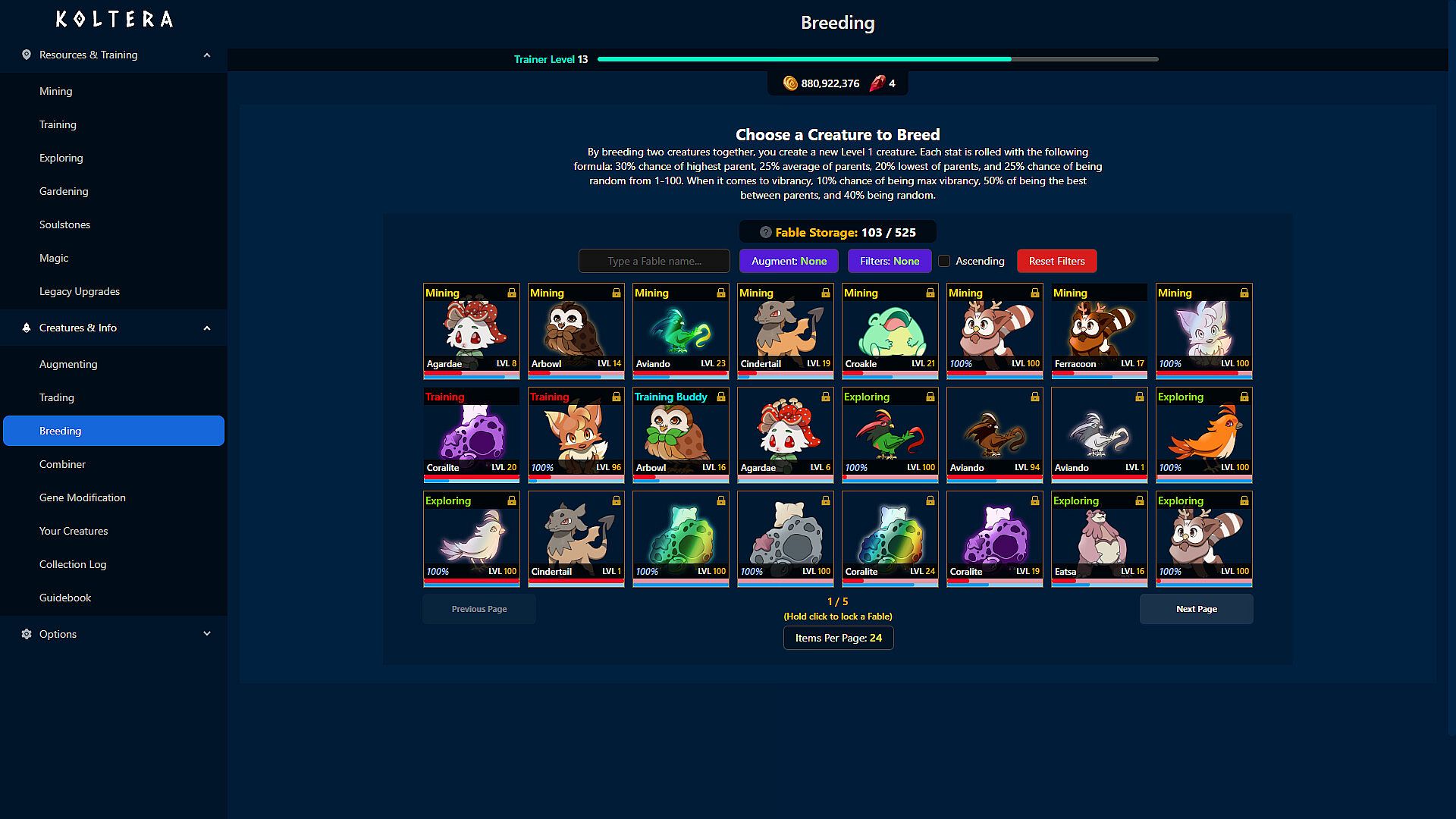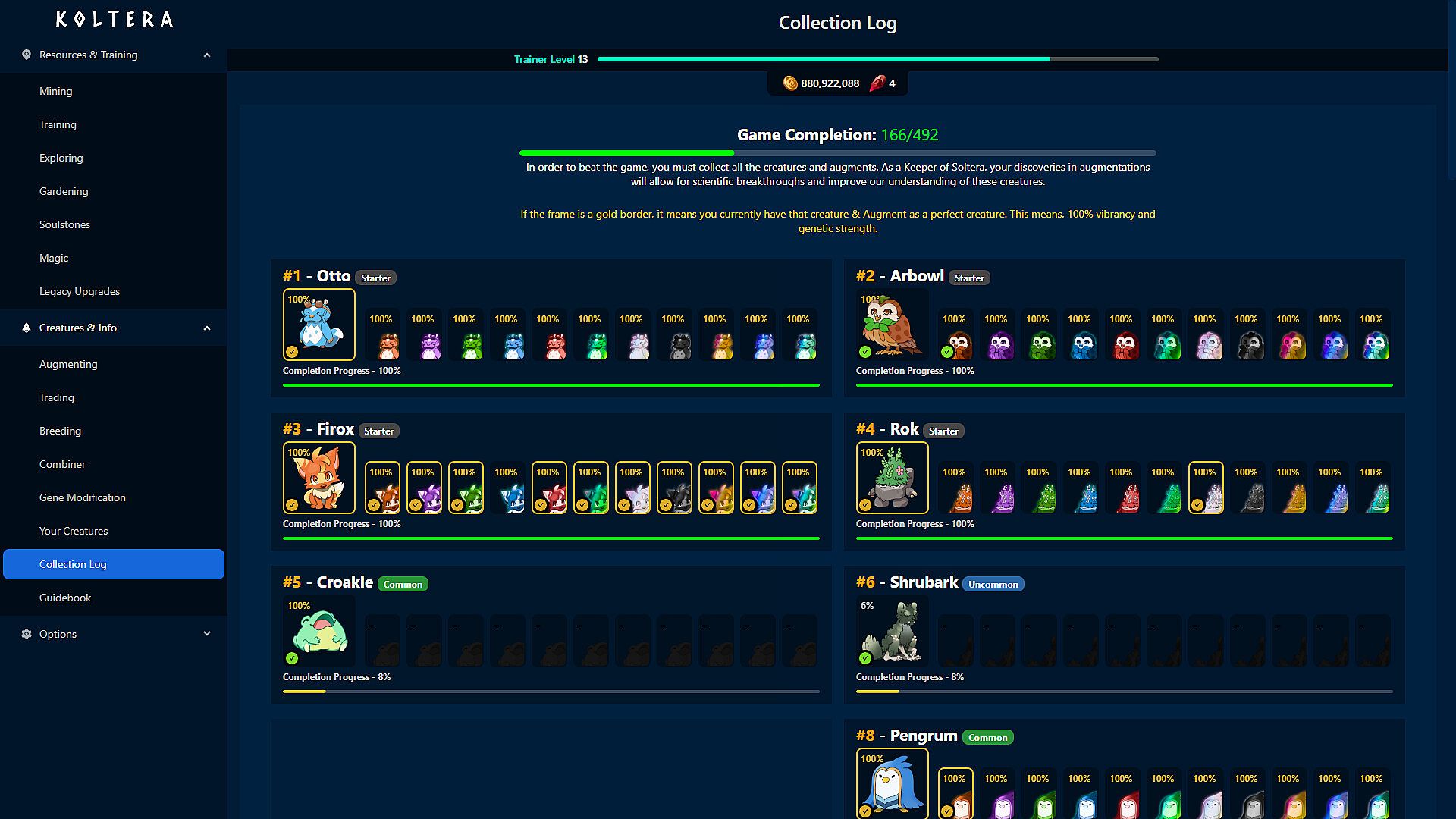 In this Creature-Collecting Idler, Koltera, you Mine and Train with creatures. As your creatures grow, they will grow stronger furthering their ability to help you. Discover upgrades that will further this output and make things easier. As your operation grows, so will your ability to discover new creatures and trade with traders. Koltera offers 41 unique creatures, each with 11 augmented versions. That's 450+ creatures to collect!