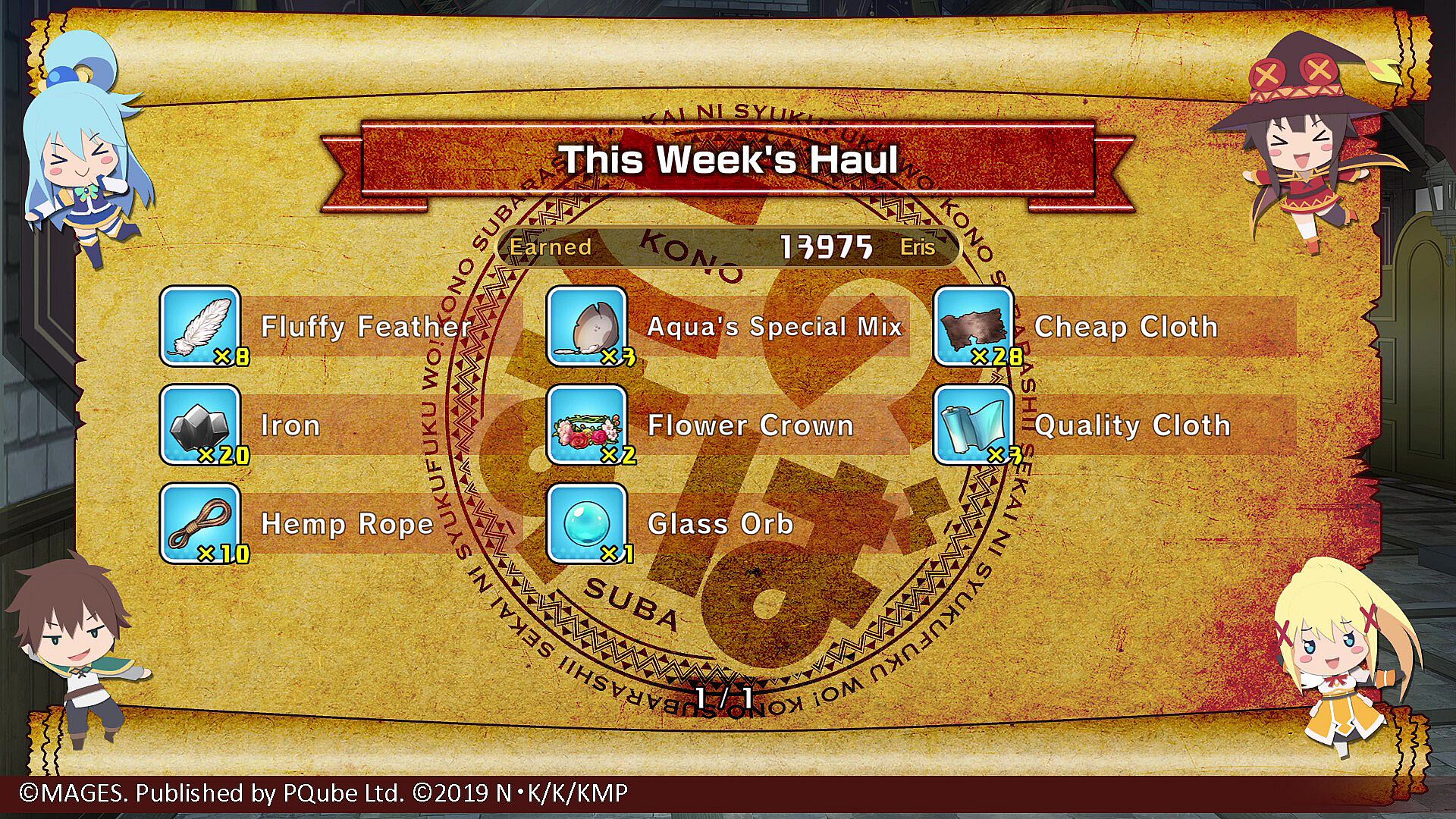Follow Kazuma and company, as they discover a mysterious "Black Slab" which curses them with desires contrary to their personality. The gang must now find and feed ingredients to the slab to create outfits which match and fulfil their new desires, and thus break their curse. Are you ready to meet Darkness as a ruthless dominatrix? How about Aqua as a prim and proper goddess? Or Megumin as the proud leader of the Lolita League?