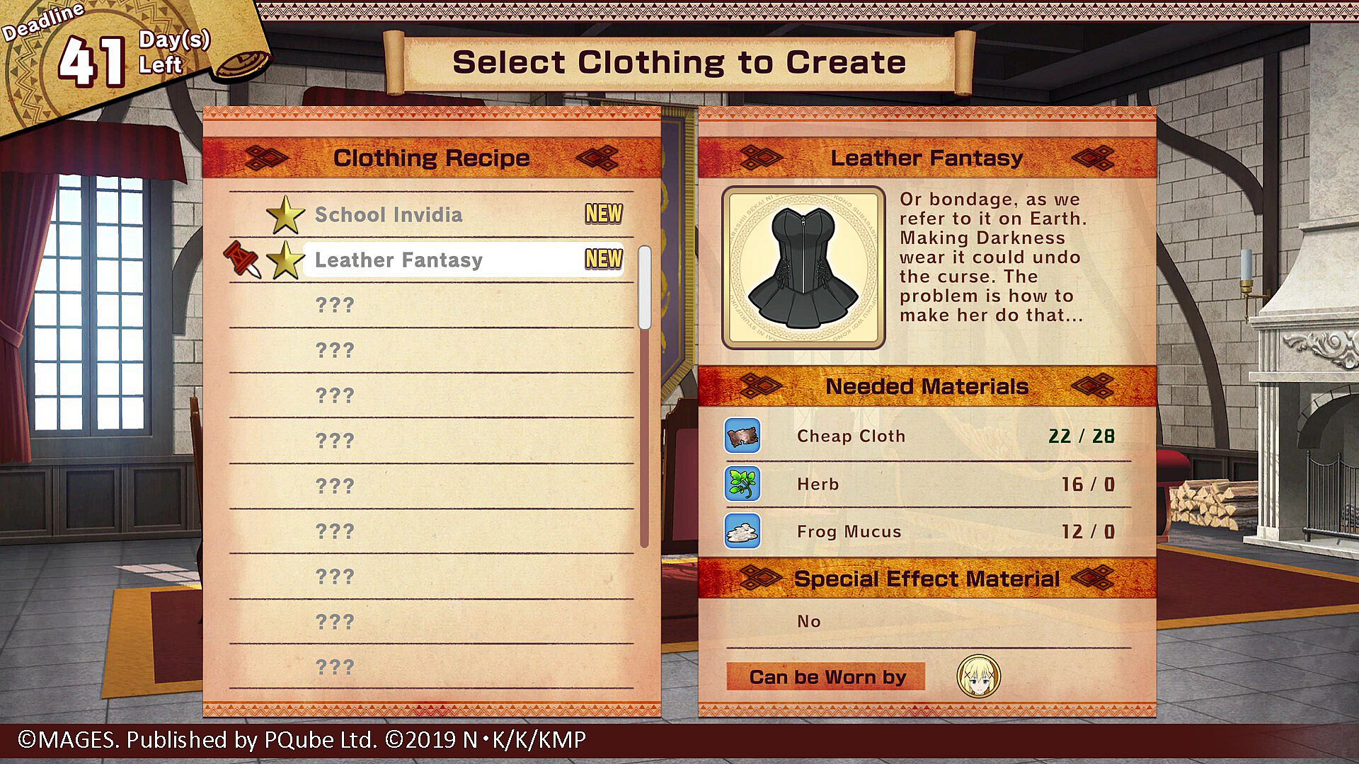 Collect resources to create outfits by completing tasks and quests. Manage your finances carefully to afford the materials you are missing, and prioritise gathering the outfit-specific ingredients you will need.
