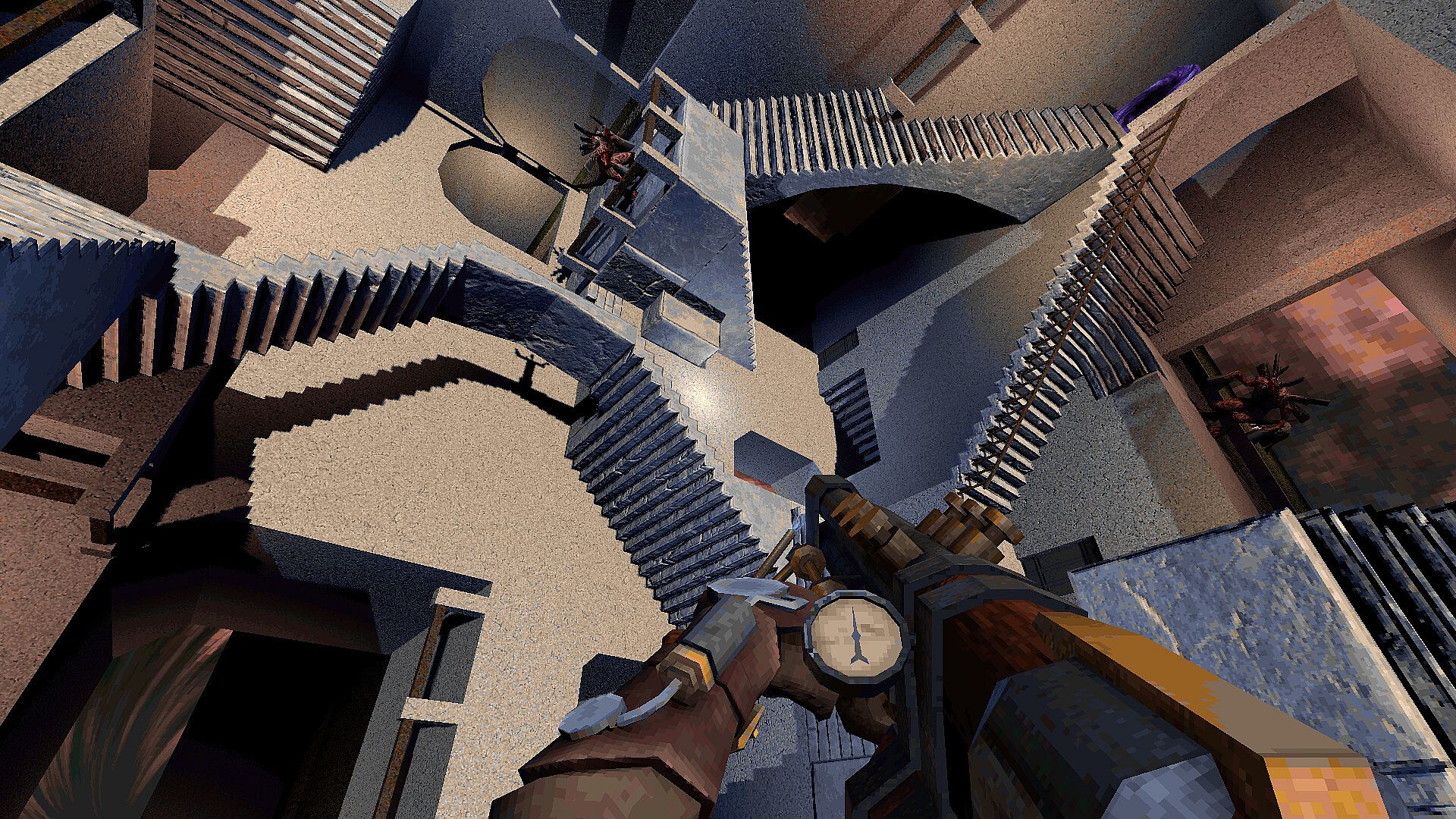 Over-the-top steampunk themed weapons often provide alt-fires with interesting utility, such as the grenade launcher which can create a gravity well to pull in enemies and physics objects to make them easier to blow up, or the flame thrower which provides a jet thrust to launch objects, enemies, or yourself around. The time vampire can create a time distortion to slow things down, and the rocket launcher can fire tracking darts. Even the primary fire can be used for utility. Spikes from the time vampire can be jumped on as a make-shift stairway to shortcut the map or find secrets.