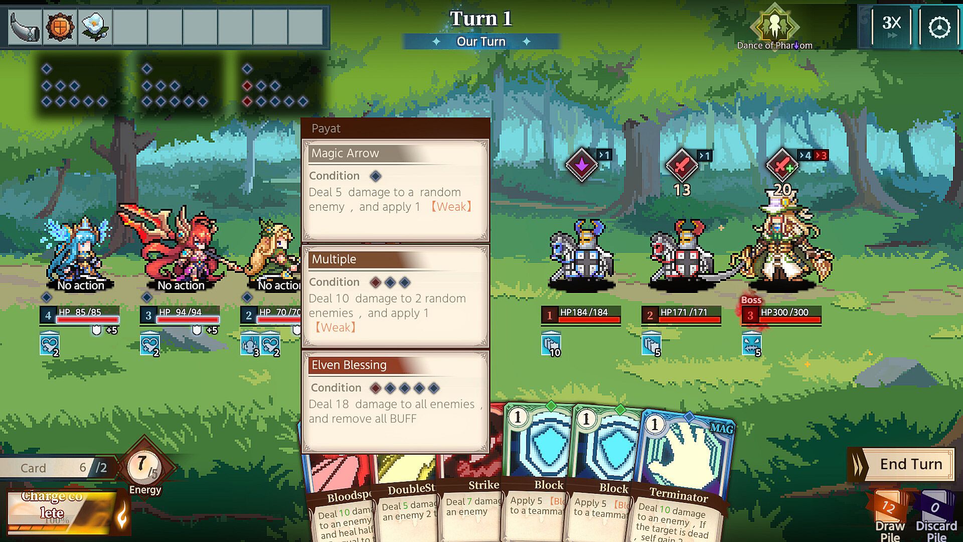 • Bosses also have special mechanisms. They increase the cost of specific cards or remove debuffs. Developing a strategy to beat them!