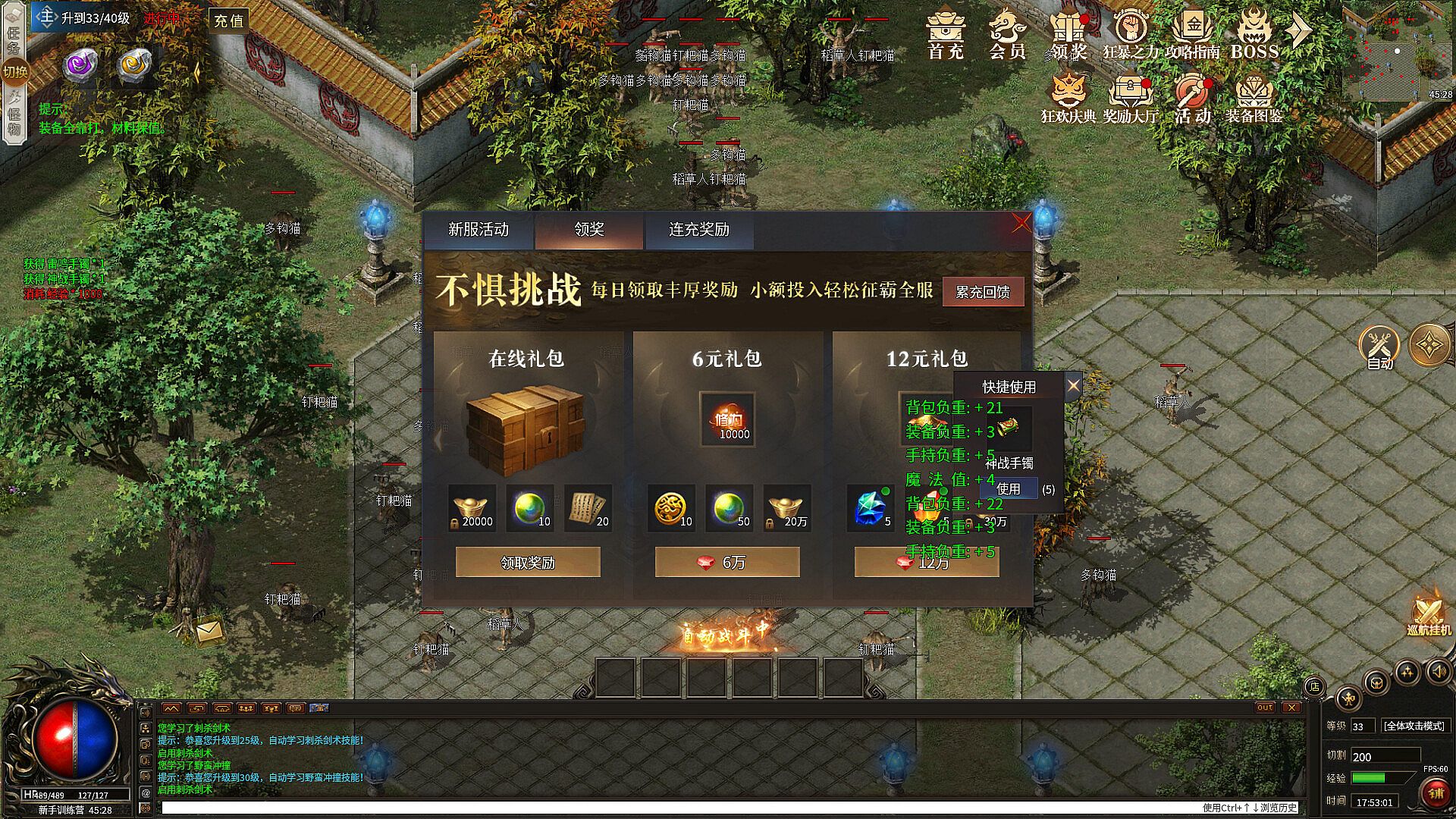 起步资金与低投入策略:开服第一时间进游戏快速升级,建议充完18元的首充礼包,自动拾取大量掉落奖励,拿到铂金会员卡秒升铂金会员,大幅度提升人物属性,快速抢占终极BOSS,开启财富之路!