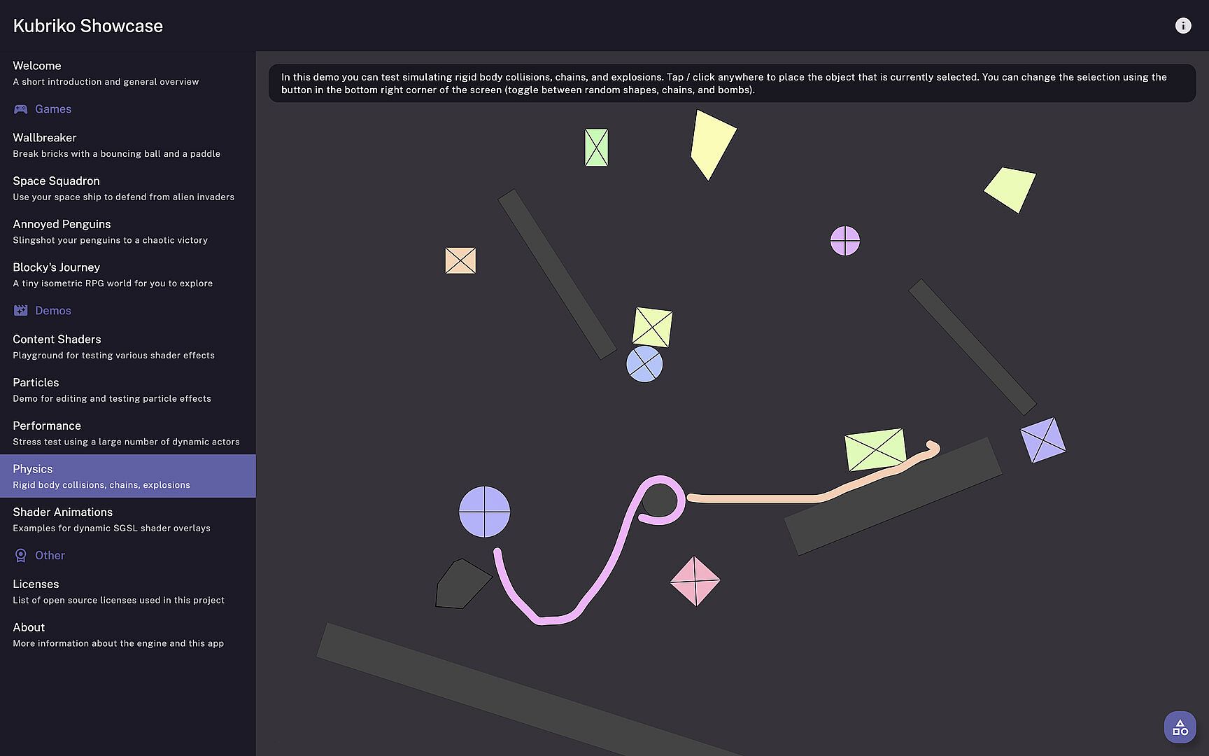 Kubriko is a Compose Multiplatform game engine, a free Kotlin library that you can use to create your own 2D games. This open-source app is a collection of small demos that show what can be achieved using Kubriko. As the feature set of the engine grows, this app will get updated as well with new games and playground screens!