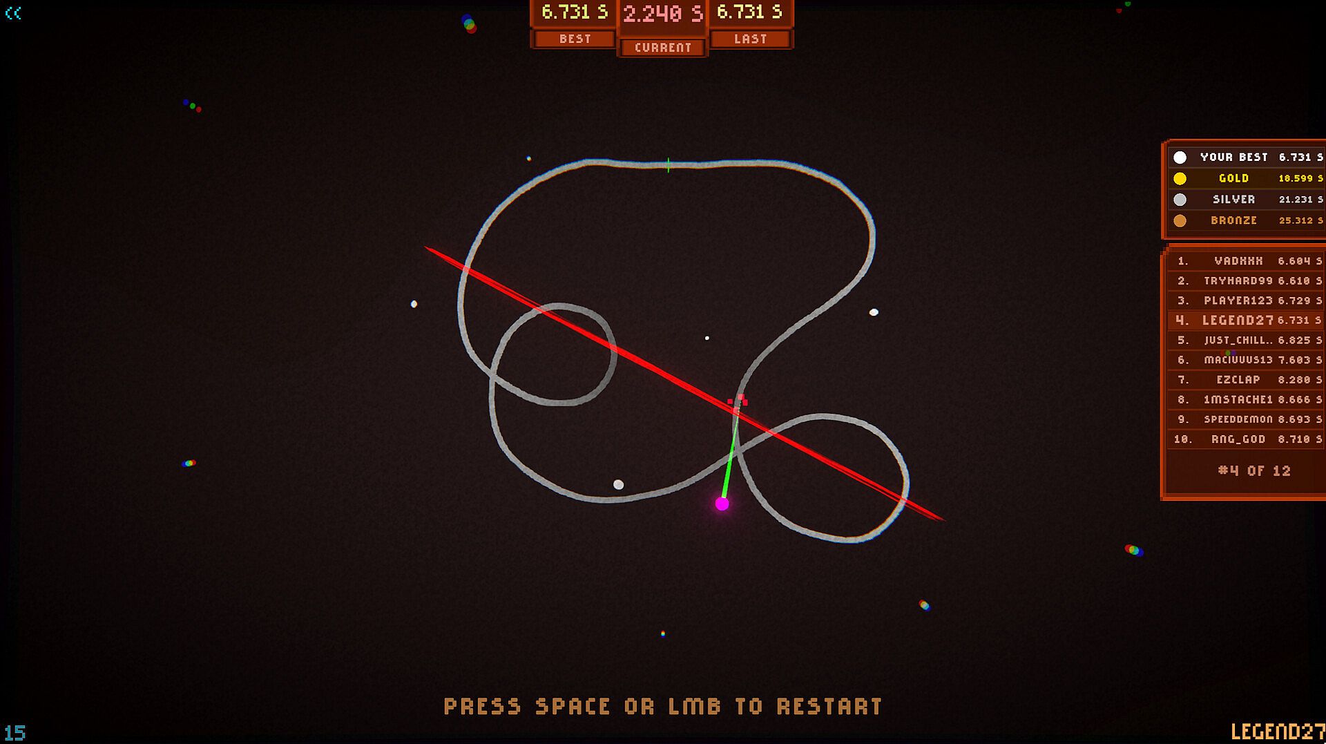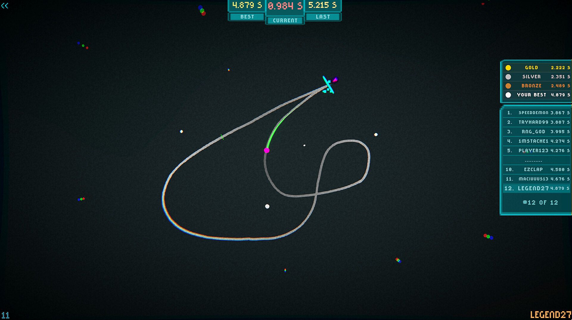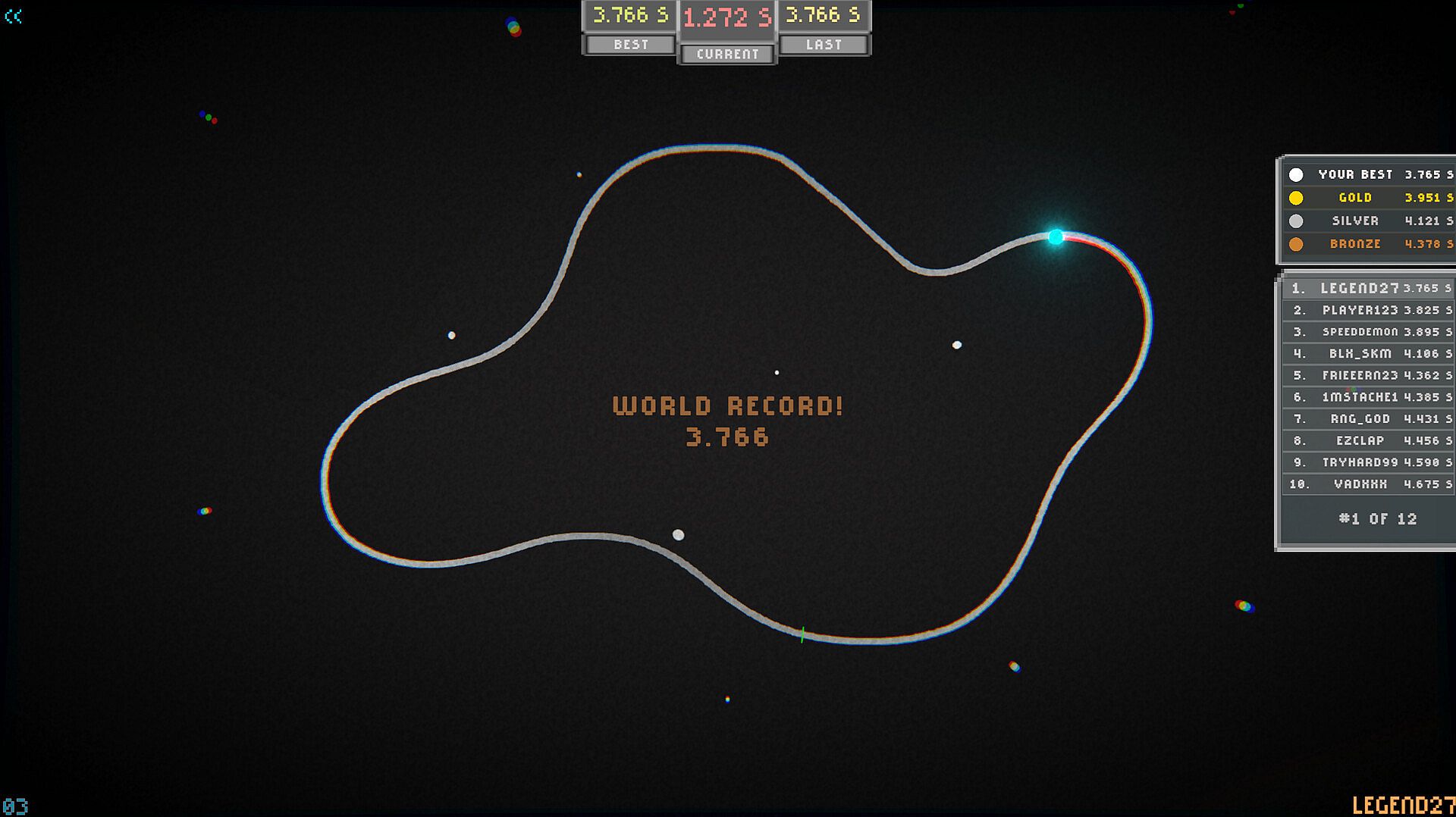 L.A.P (Loopin' Around Planets) is a minimalist time-attack racing game where you control a spaceship with just one button. Each track introduces different mechanics that change how you approach the race. The game offers multiple tracks across different galaxies with increasing difficulty. New monthly challenge track appears every month.
