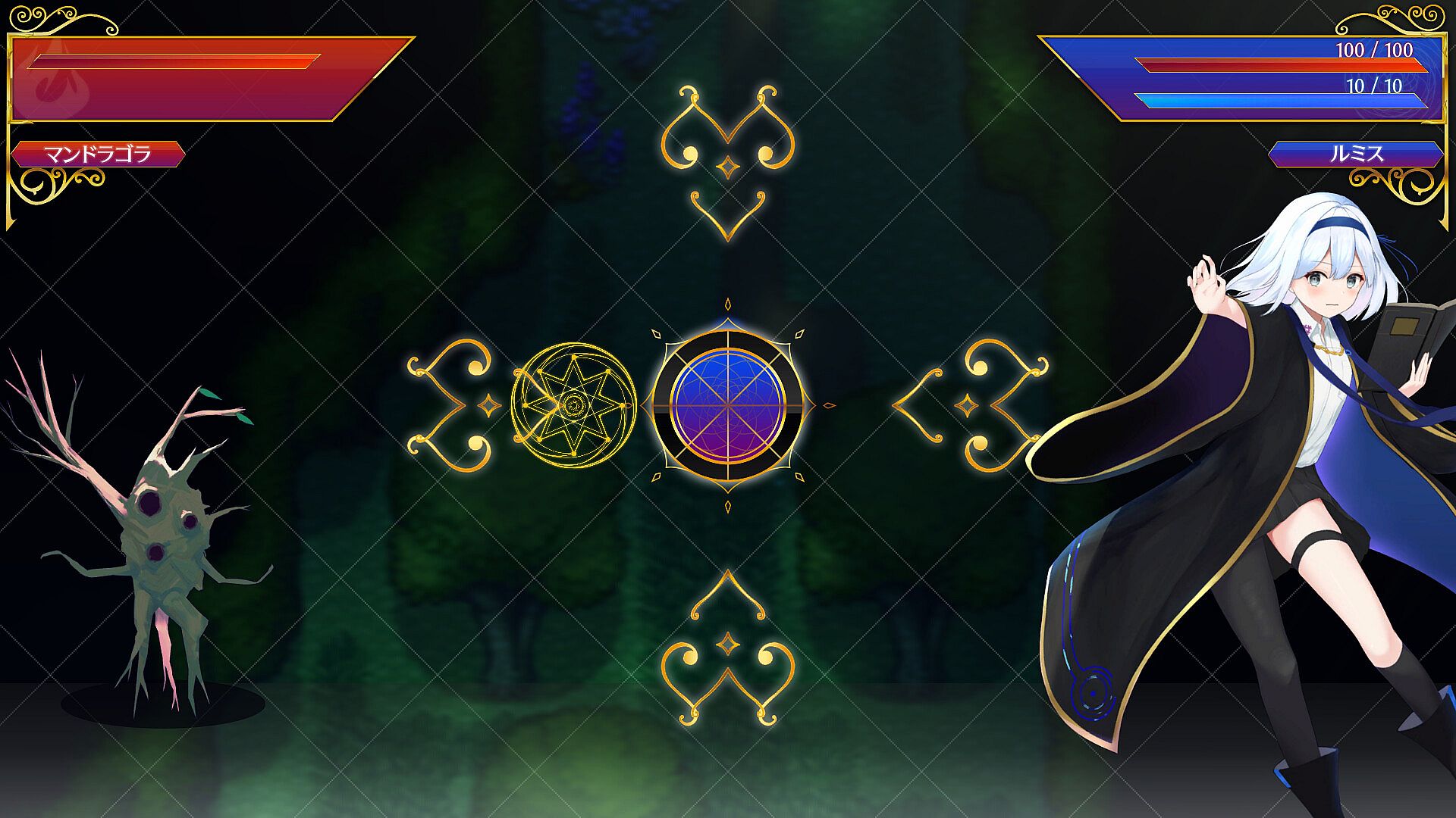 In the battle, enemy attacks are represented by a skill cursor, which looks like a magic circle. At the center of the battle screen, there is an area called a marker. When the skill cursor is just over the marker, press the button for a successful reflection. The game is designed in the style of a rhythm game, in which the player parries the movement of the skill cursor to move in various ways, such as straight lines, curves, waves, and rotations.