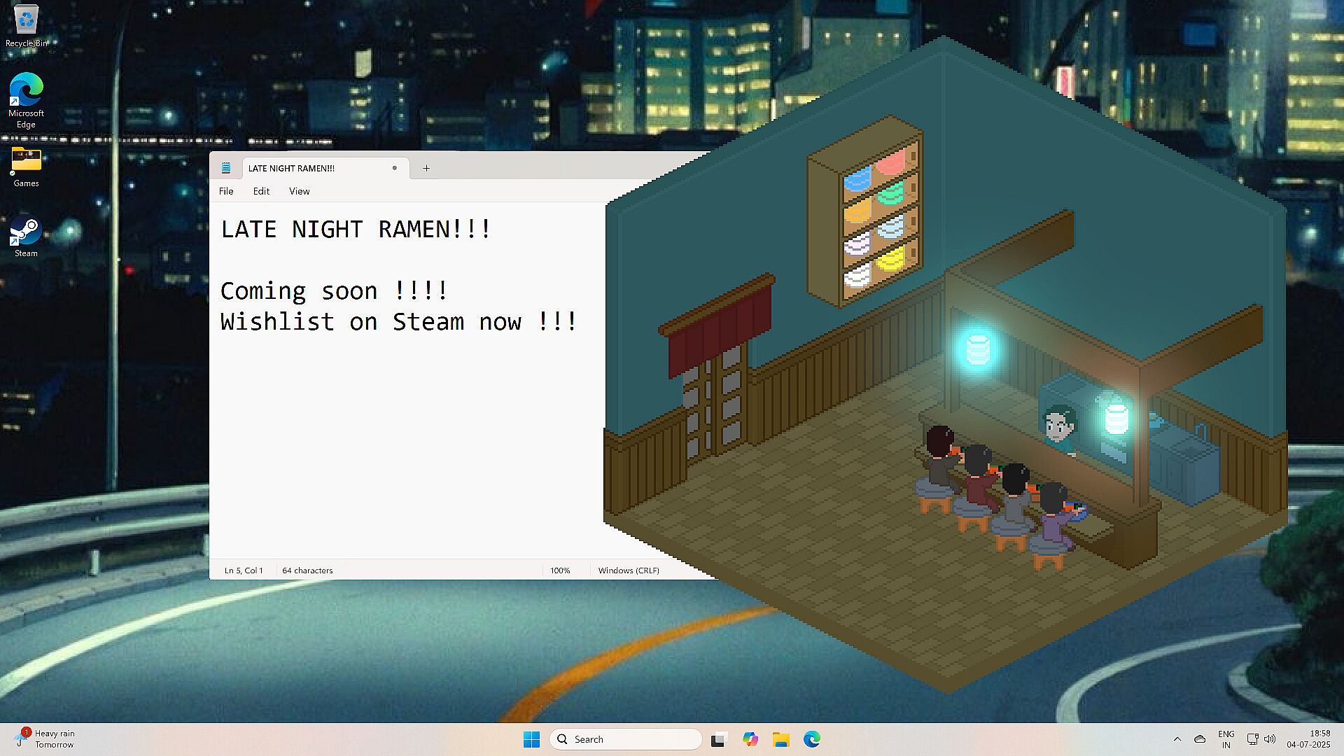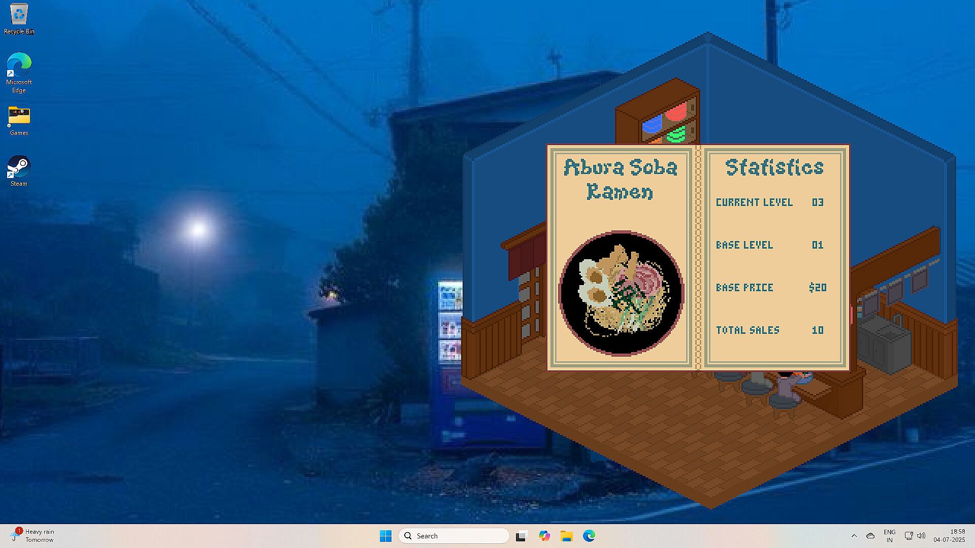 Late-Night Ramen is a cozy, isometric, section-of-the-screen cooking sim where you run a small ramen house after dark.