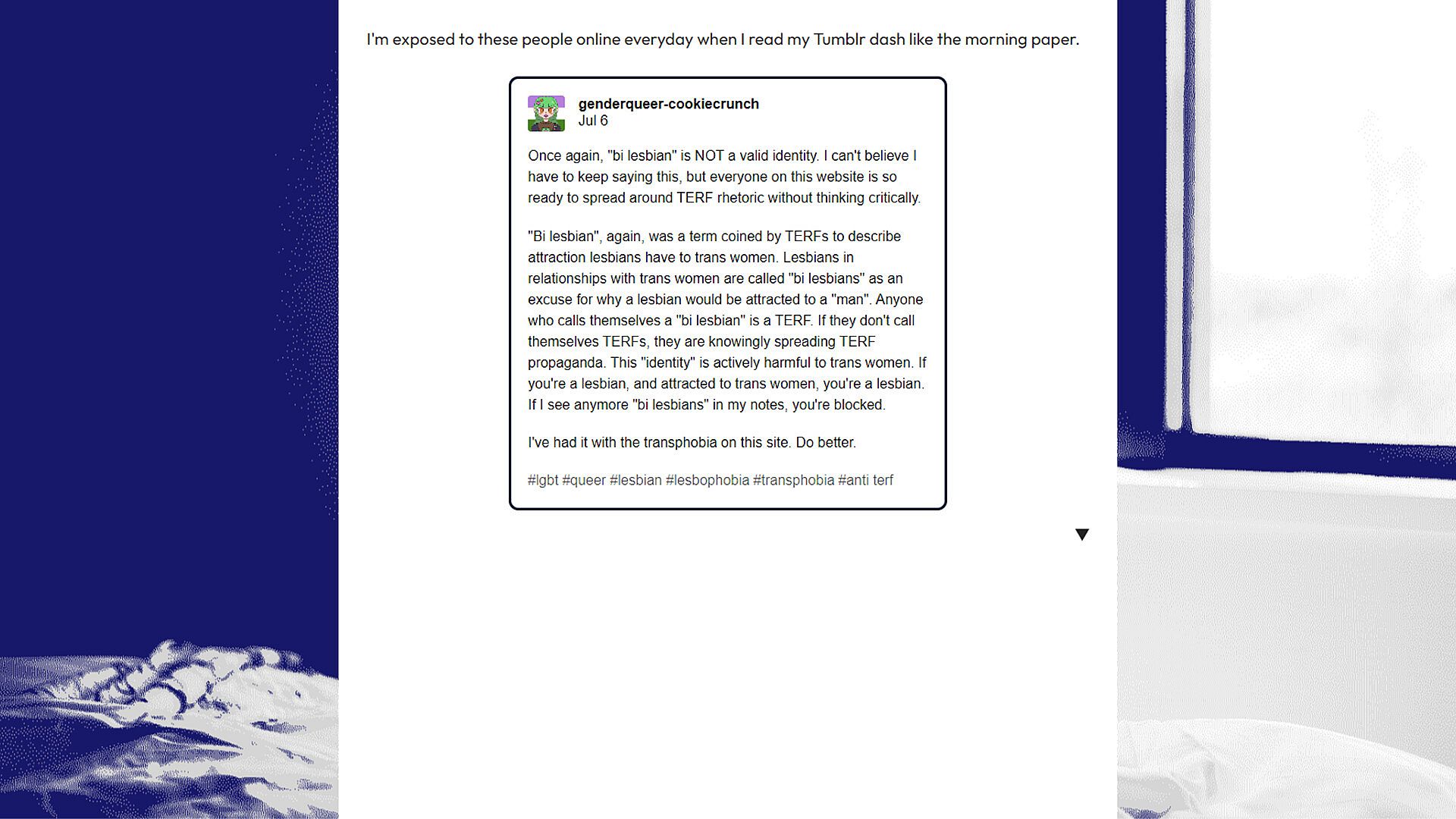 A first of chronically online Tumblr users. I've drifted in and out of several and now exist in one with next to no ties to my home country.