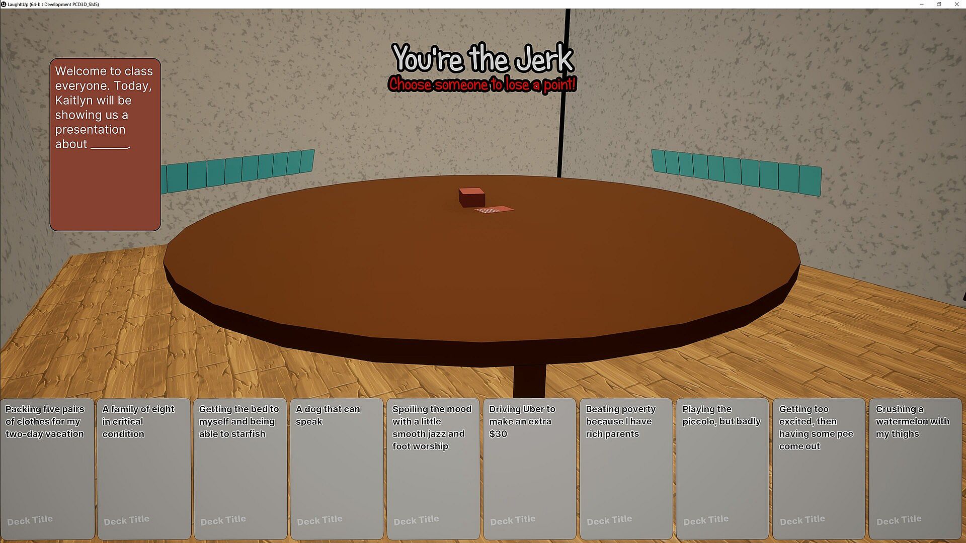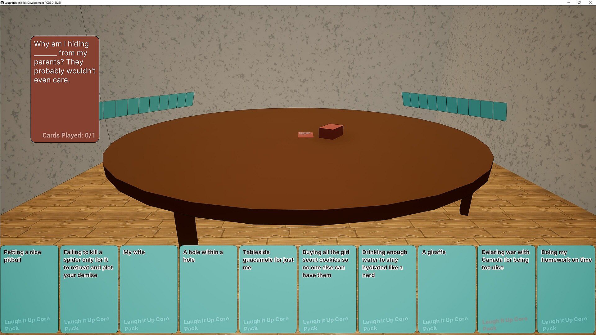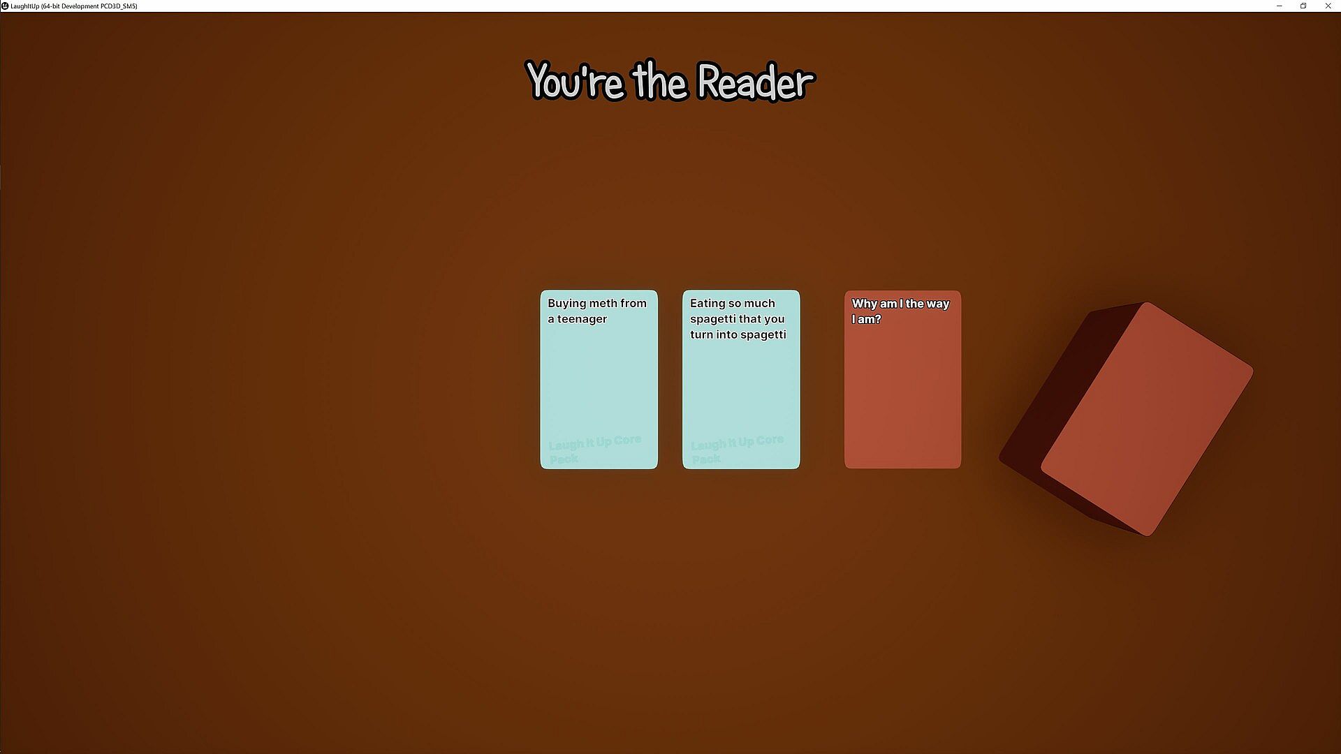 Laugh It Up is a labor of love made by two buddies in our free-time. It has been our dream getting to work on this game but we want to add more! We want you, the player to be able to share your hilarious (or dumb depending on how people see your sense of humor) custom decks with everyone through Steam Workshop. We want to port the game over to Mac, that way you can play with your loser Mac friends. If our game is popular enough we will add this and more for free! So here is our roadmap that we will update!