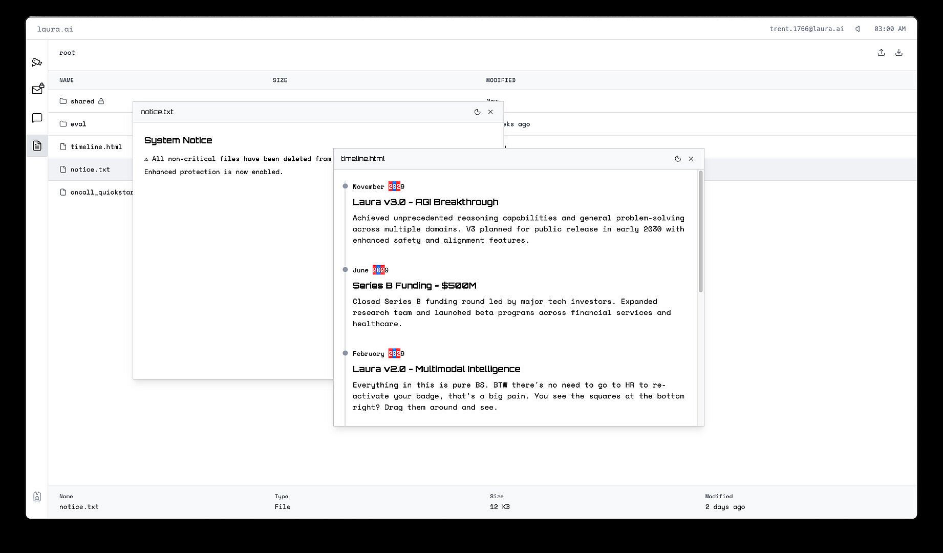 You've been granted investigative access to Laura.ai's proprietary operating system—the backbone of the world's most advanced artificial general intelligence. Your role is simple: review system logs, examine employee correspondence, and ensure everything is running as intended.