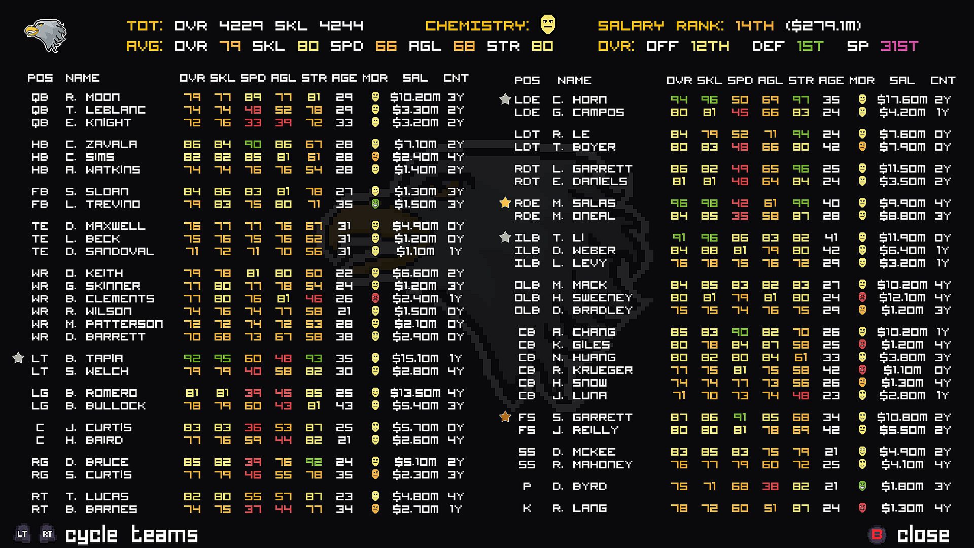 Select your favorite team and play through an infinite number of seasons to see if you can win the Legend Bowl! You'll start off by selecting your favorite team and creating your very own coach or choose from an existing coach from the league. From there you'll play a full 17 week schedule, complete with player wire events, player and team stats, weekly wrap up news, and more to keep you engaged along the way.
