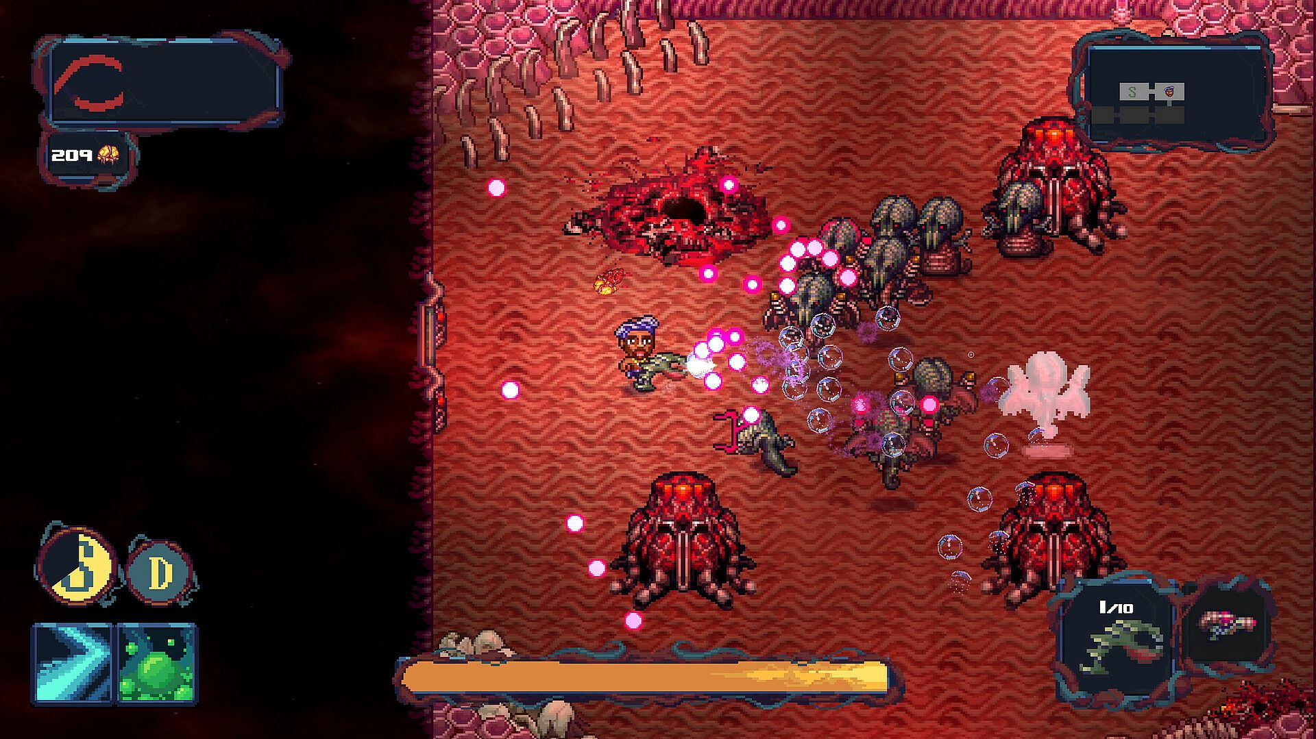 When you destroy spawners you get organs. There will be gun stores you can locate around the level. Use organs to roll for a gun and choose one from the three guns rolled.