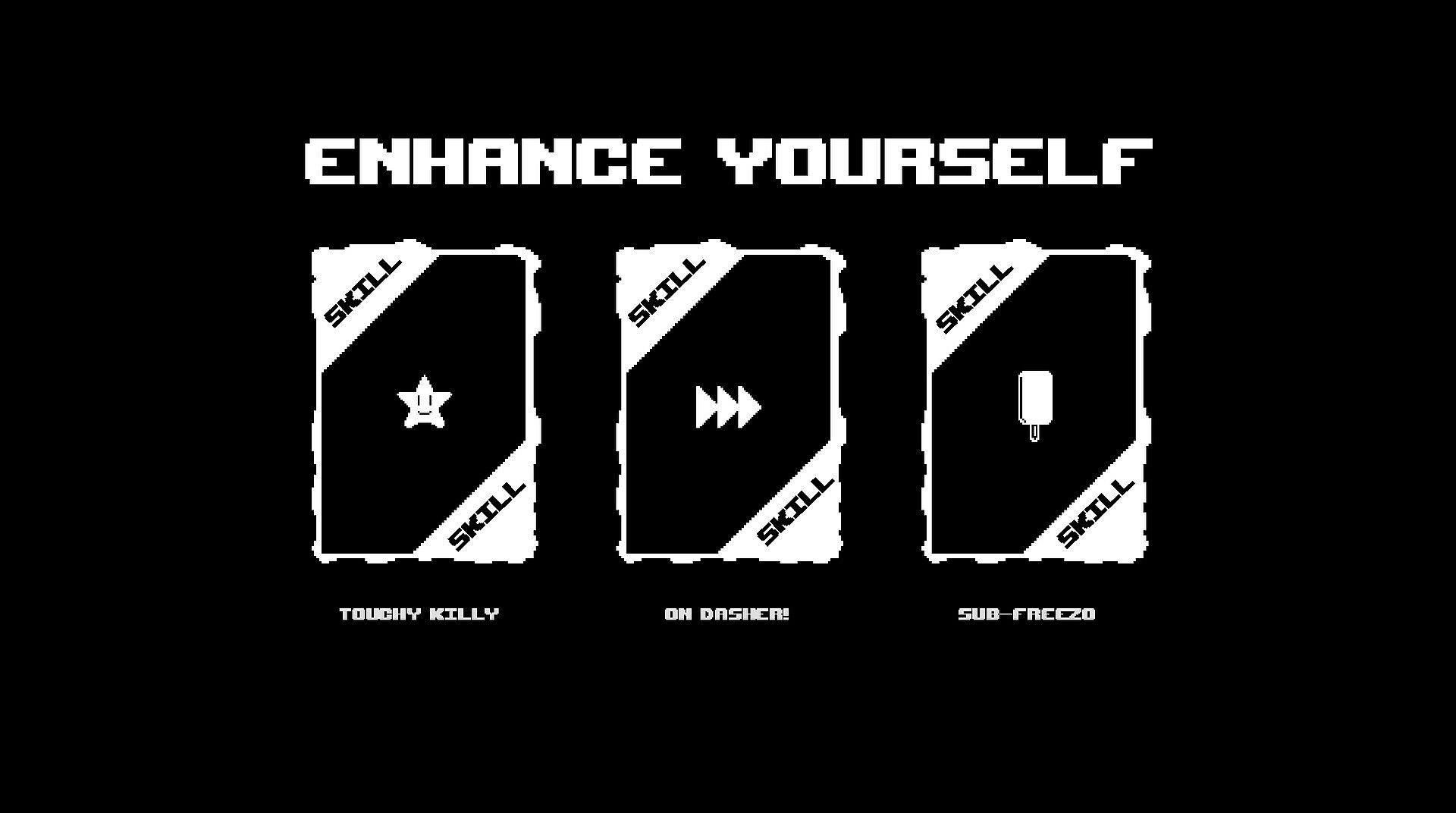 When you beat the MINI-BOSS at the end of each sub-level you will get a permanent, reusable skill, like damage enemies on touch and become invulnerable, poison all enemies, etc. You are able to have two of them equipped at the same time.
