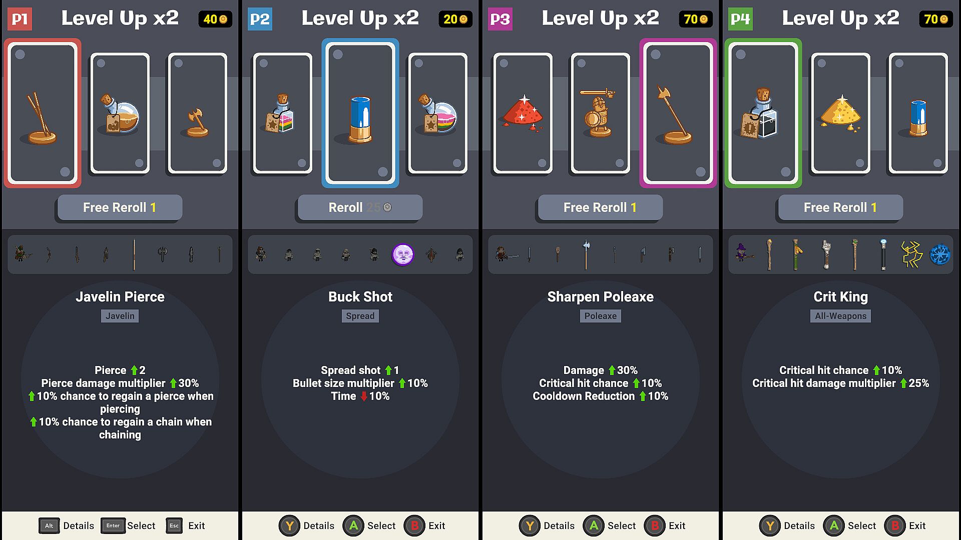 1 of multiple game modes -- The standard way the game was meant to be played. Dungeon crawl through procedurally generated rooms, kill all enemies, level up, and get that sweet, SWEET, loot! Struggling with your run and need a boost? We got you. Get rewarded at the end of each run, even if you fail. Rewards can unlock meta progression upgrades to make your runs easier. You got this buddy. A different game mode featuring it's own 24 hour leaderboards. Top daily scores are posted in the Letter Lancers discord server. A procedurally generated ruleset our servers generate that changes the gameplay experience everyday, adding different gameplay modifiers, allowing for only certain characters to be used, mixes up enemies spawned, and ether increases the player's power scaling fantasy, or gives you a real hard time. How far will you make it? Equal playing field: Meta progression upgrades are disabled in this mode. Disclaimer: An active internet connection is required to play the Daily Challenge mode. (You can still play other modes without an internet connection) Compete in leaderboards specific to level, amount of players, and game mode. Standard mode leaderboards are reset with every major update. Daily leaderboards reset every 24 hours, and top scores are posted and immortalized in the Letter Lancers discord. Disclaimer: An active internet connection is required to post your leaderboard scores. (You can still play without an internet connection)