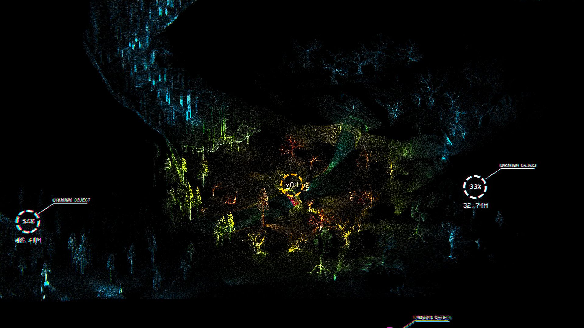You find yourself in complete darkness, in which you can't see anything, but thanks to the scanner you can find your way.