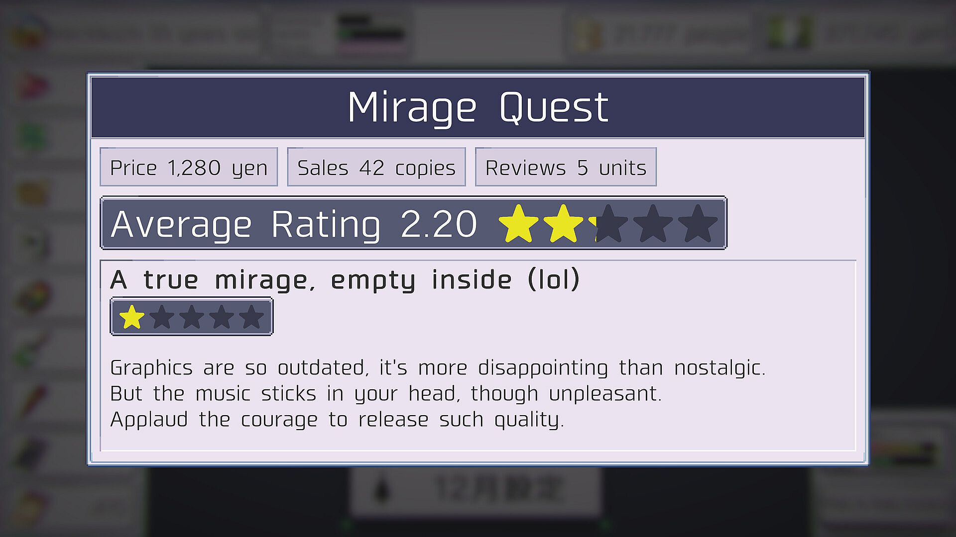 ■ You can’t form a team or company; you will make games alone forever. Outsourcing and buying assets are allowed, though.