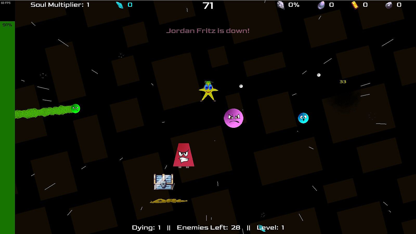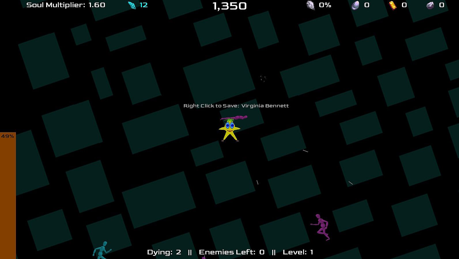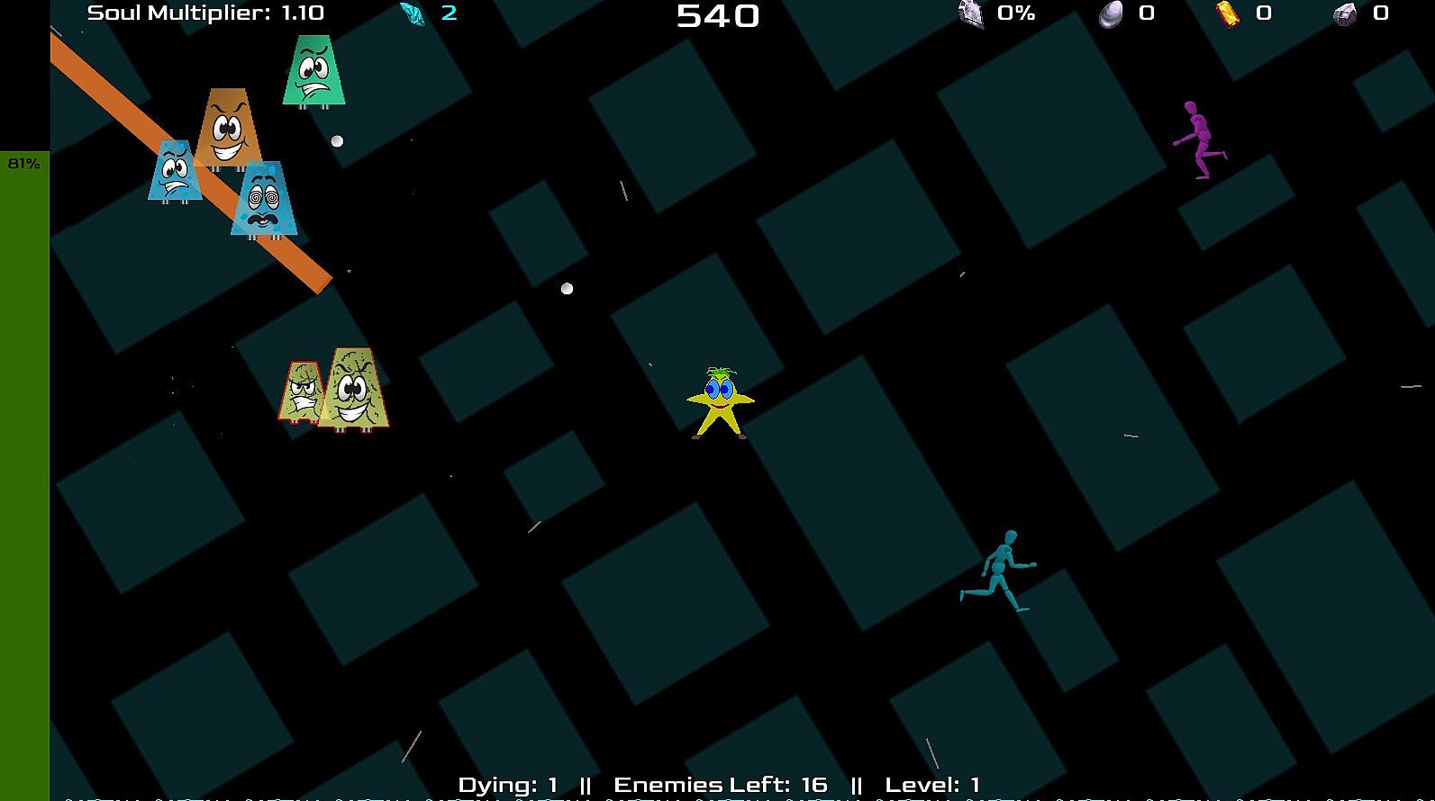 Use a mouse and keyboard or an Xbox compatible gamepad to control Super Star Dan and avoid letting your health bar located on the left side of the screen drop to zero. If your life ever drops to zero, there is no 'extra lives' and it's game over! Blast the incoming war time shapes of negative raw emotions that are trying to rip you apart while amassing a worthy war score! At the end of each level, choose to advance through the white door to proceed to the next level or spend your soul shards on upgrades by taking the green door. Keep in mind that spending your soul shards you've collected will lower your score multiplier, so there's always the temptation to keep going and risking death just to get a higher score!