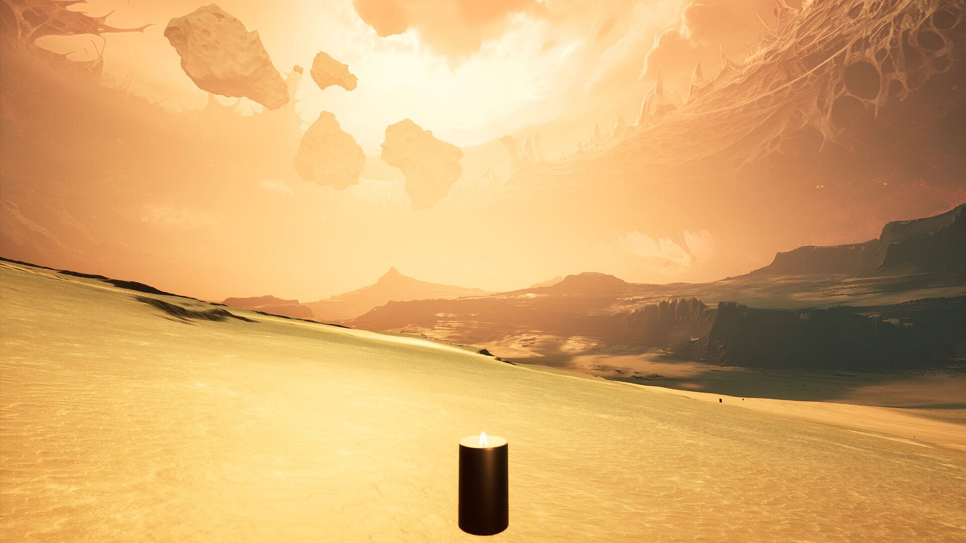 You light the 11 candles. There is no sound, no one around. In the vast open world, a single monolith stands, marking your time in hell. The sole purpose is to keep the flame alive.