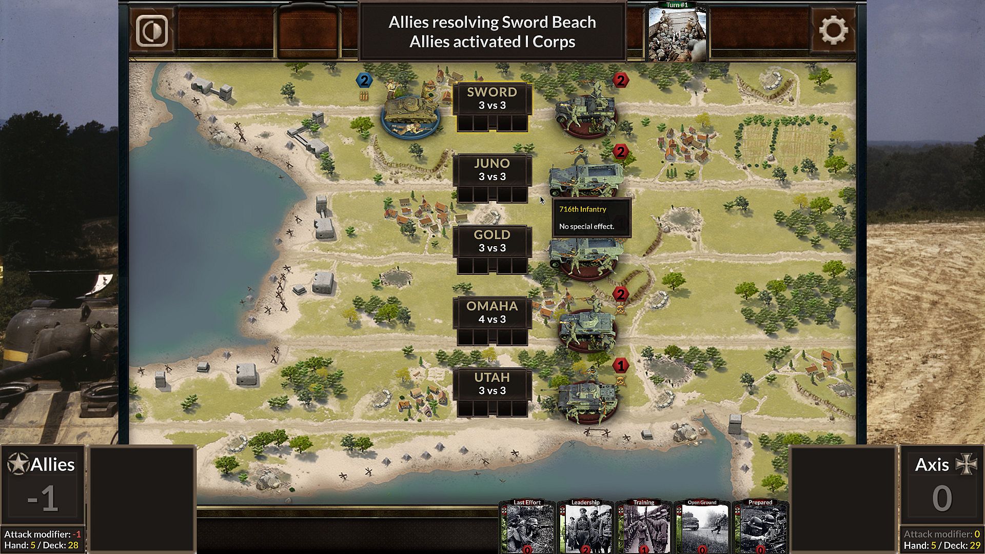 However, the Axis has the starting advantage; the Allies need to avoid being caught dead in the water. Although most units are preassigned to a beach, each game is won or lost by the placement of cards that provide additional forces or support. Not only is the state of each beach important to consider for these decisions, but also the geography of the coastline - after a beach has been won, the victorious forces can flank adjacent beaches. Both players must always be thinking ahead, looking for ways to best utilise their cards down the line.
