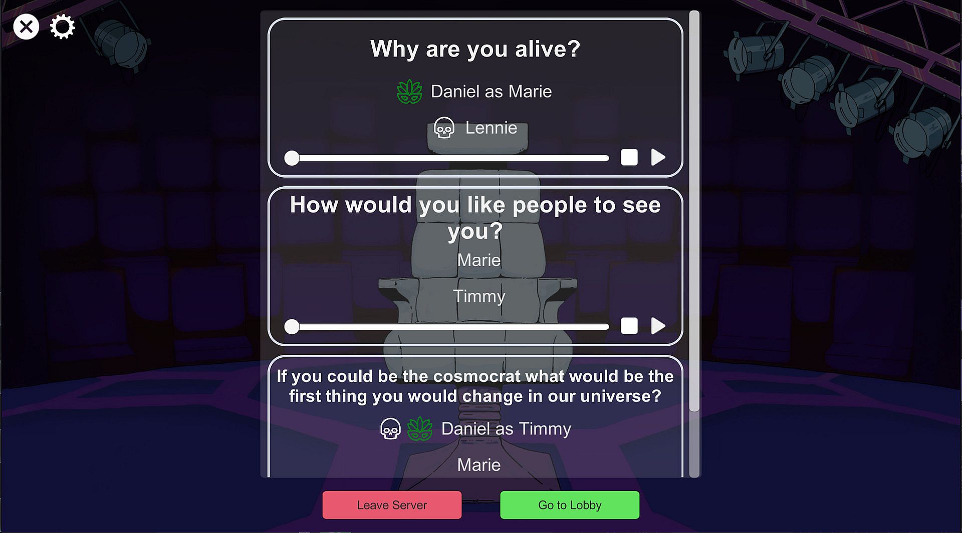 As your voice chat partner judges you by your every word choice, claimed opinion and speech patterns, you have to both convince your opponent that you're the person you're disguised as, as well as that you're earnestly examining them on their own realness. Many strategies can lead to victory, but all require acting skills, smarts and, most of all: confidence.- Hours of replayable fun. No round is the same!