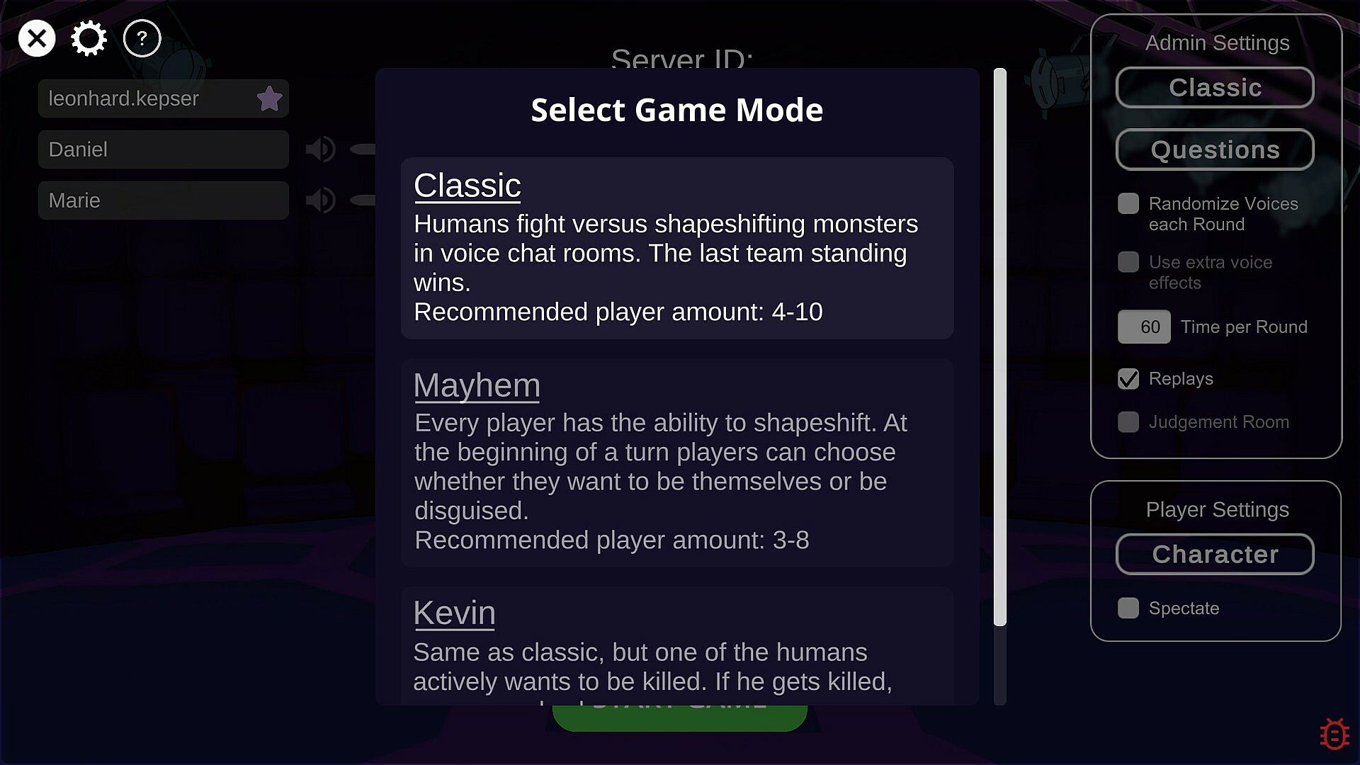 It's the year 20XX. In a future devoid of societal empathy the only path left to true human connection is through violence. Five of the universes hottest bachelors have been acquired from around the galaxy and as a shapeshifting alien is set loose upon them they have been given only two options: truly understand one another or die.In this revolutionary new kind of social deduction game players voices become indistinguishable from one another thanks to a new machine learning powered voice filter. Each round players get paired up in rooms together where they have to closely inspect one anothers "realness", as one of them has taken on the role of a shapeshifting monster and disguised themselves in the skin of their friends, trying their best to emulate their speech patterns and opinions.