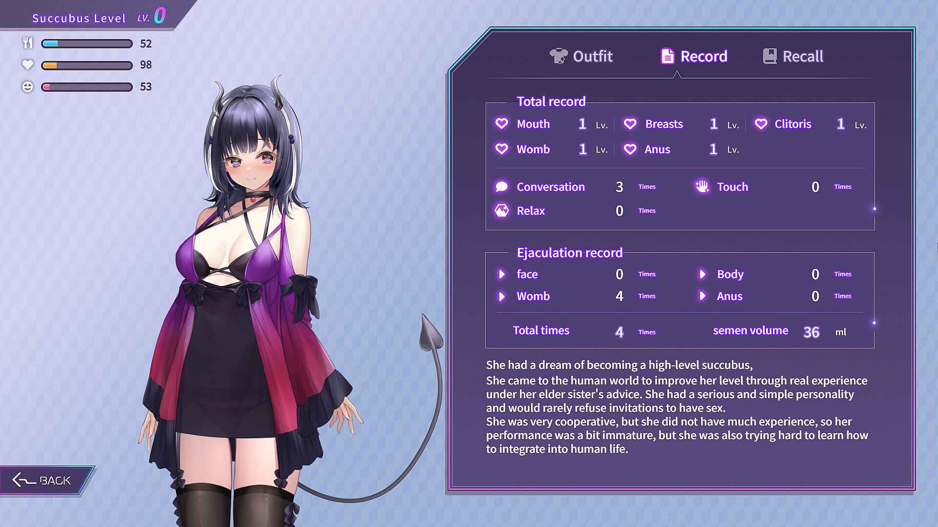You need to keep an eye on Lilim's [Satiety Level], feed her before she gets hungry and accumulate semen to raise her [Succubus Level], and raise her [Affection Level] and [Slut Level] through interactions. Lilim will react differently according to the values of these levels, which will also affect which ending you get.