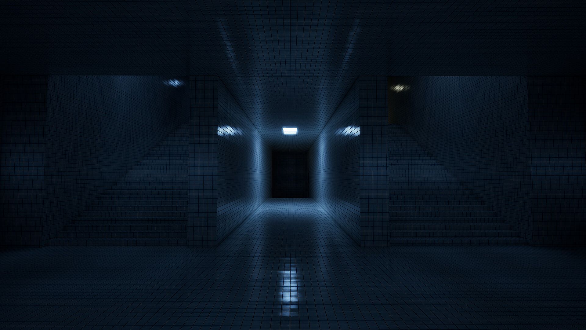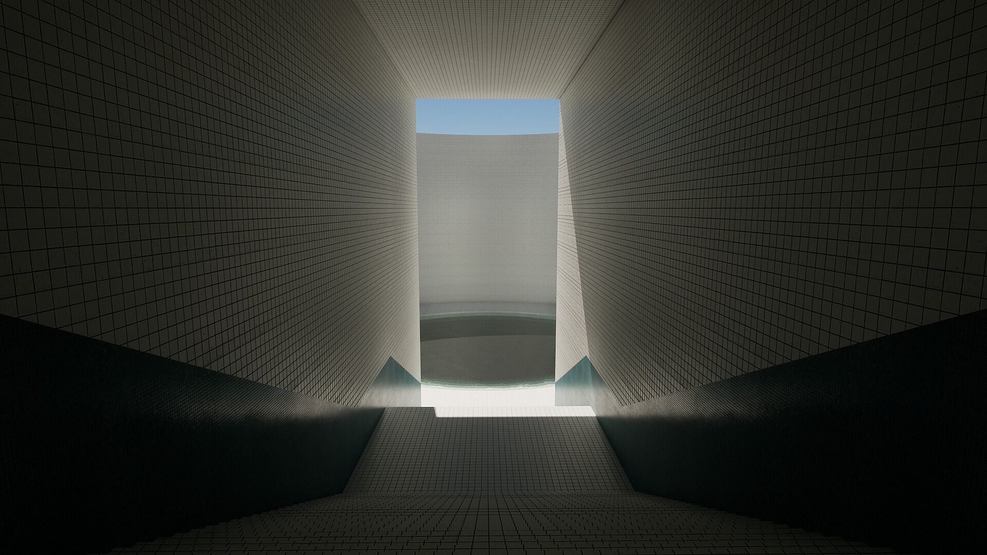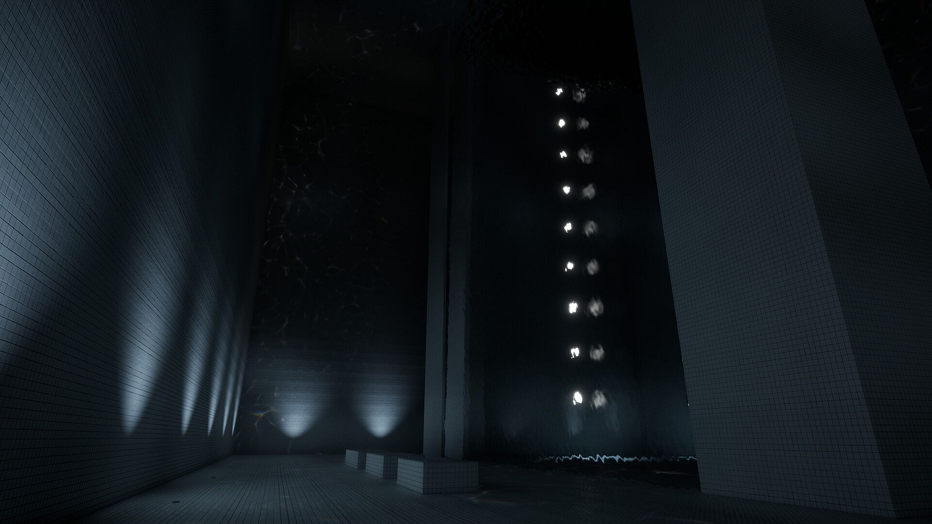 The journey begins here, in a place of endless, reflective water. Pools stretch infinitely, white tiles gleam under harsh lighting, and the sound of distant water echoes throughout.Faded Memories