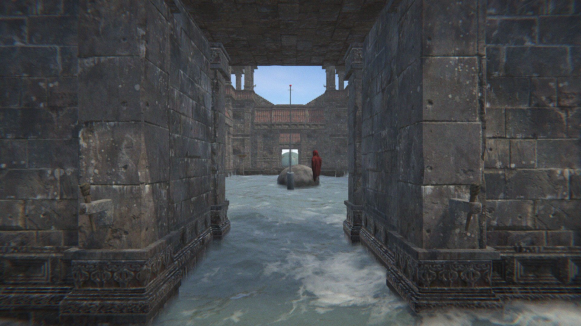 All environments stretch across a shifting water surface that mirrors the world around you, giving it a dreamlike, sometimes unsettling quality. You move through floating platforms, vast landscapes, silent buildings, long corridors, and wide open spaces where brighter passages alternate with subtly oppressive corners. The peculiar architecture, empty rooms, endless horizons, and the water beneath you create worlds that are both fascinating and strangely unstable.