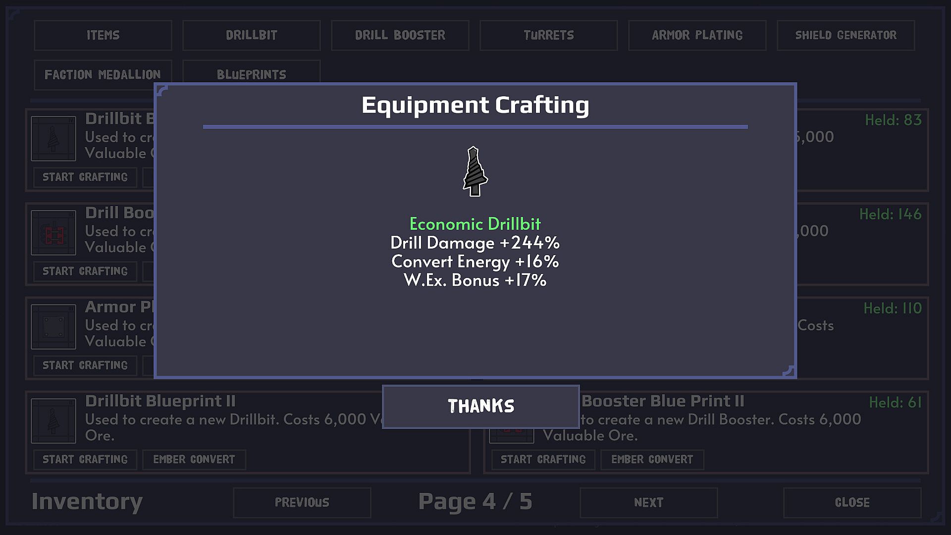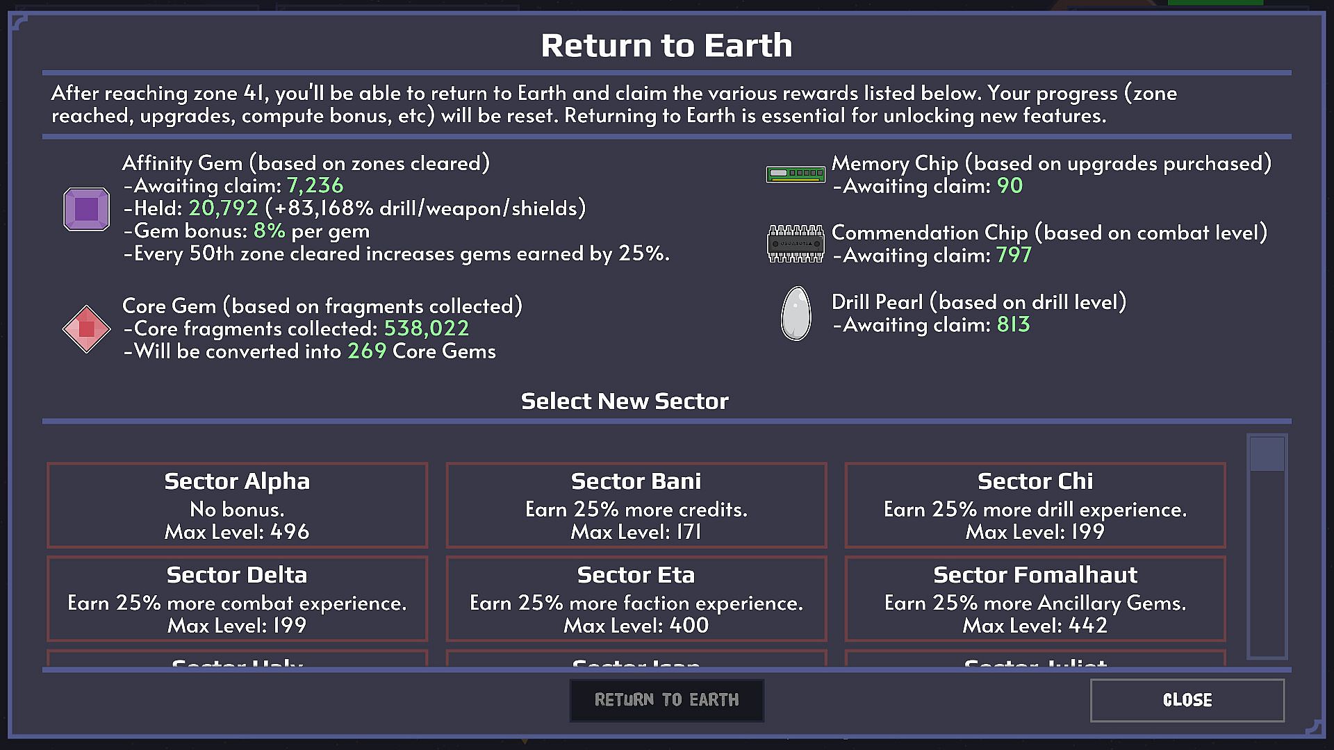 • Return to Earth (prestige) and earn 5 different resources, which can be used to build help or upgrade your stats