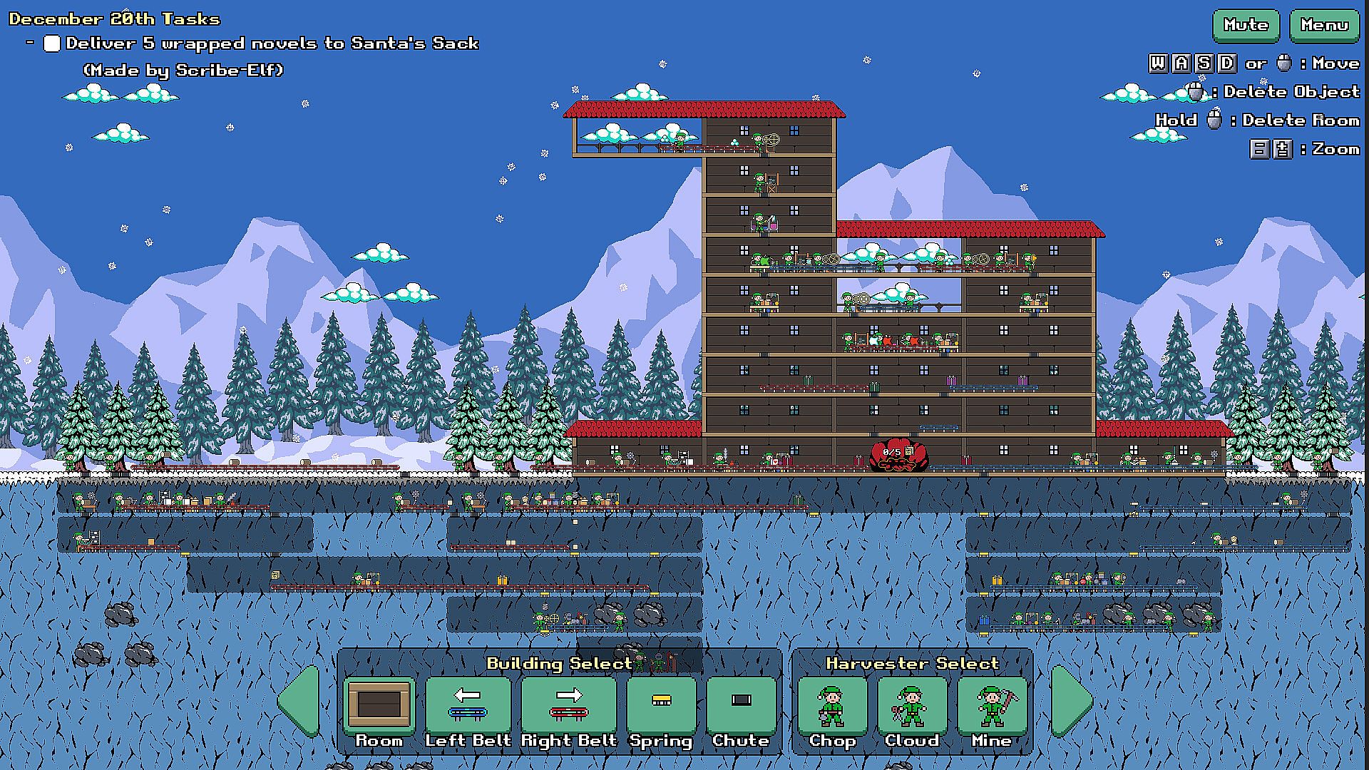 Build Santa's North Pole toy factory from the ground up in this festive automation game. Fill your workshop with conveyor belts, harvester elves, and toymaker elves. Place floor springs to bounce items to a higher floor, or chutes to drop items to a lower floor. Lay out a perfect factory so that every elf is supplied with raw materials, and all the finished toys make it to Santa's sack.