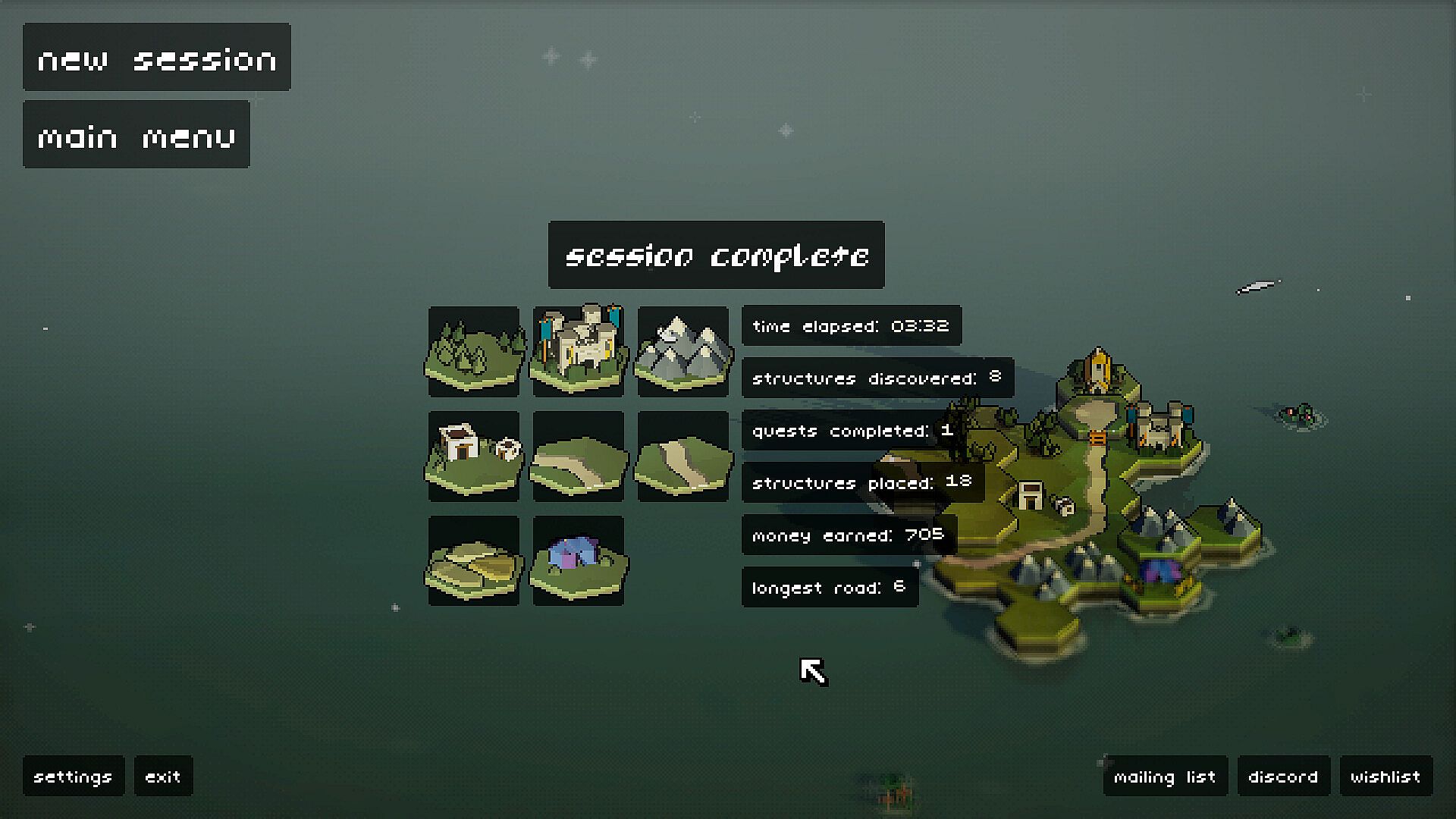 Every session is different. As you expand, you'll discover new buildings with unique effects. Roads that multiply the income of their surroundings, but must always be connected in long segments? Rivers that triple the income of their surroundings, but can only be built downwards? Lighthouses that raise columns from the sea, allowing you to build in those final crucial positions so you can squeak out one more island expansion?