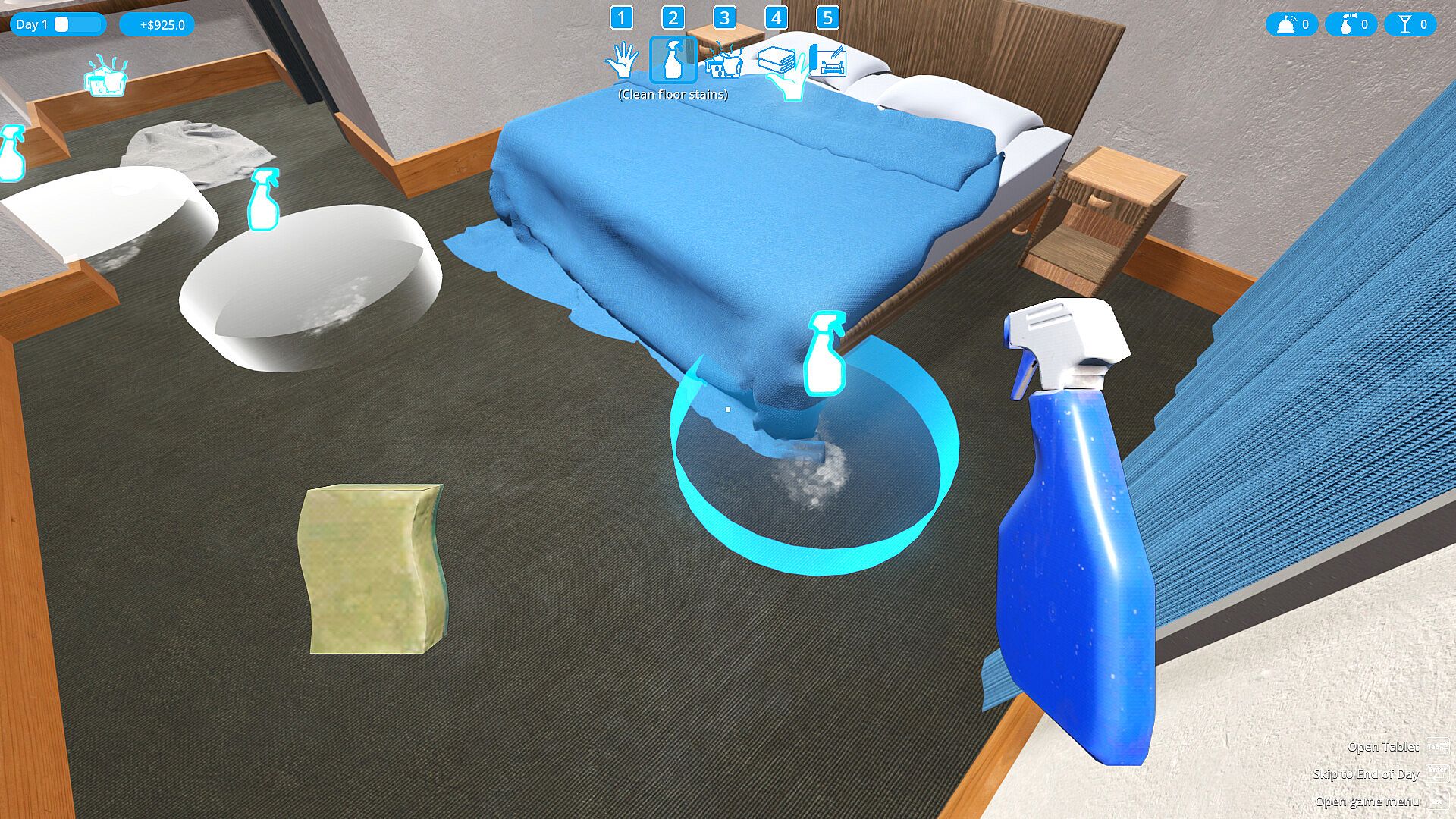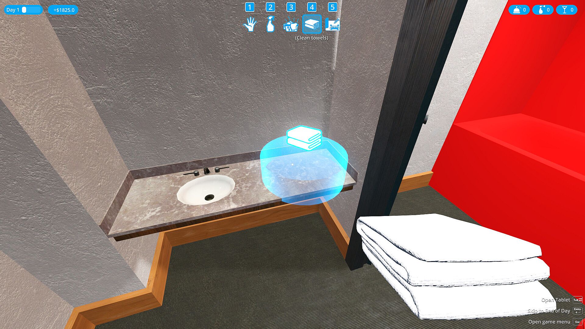 After the customers have been checked in at the Reception, and spent a day at your hotel you will need to clean their rooms at the start of the day, by picking the dirty towels, cleaning the floor stains, restocking the room's clean towels and lastly make their beds