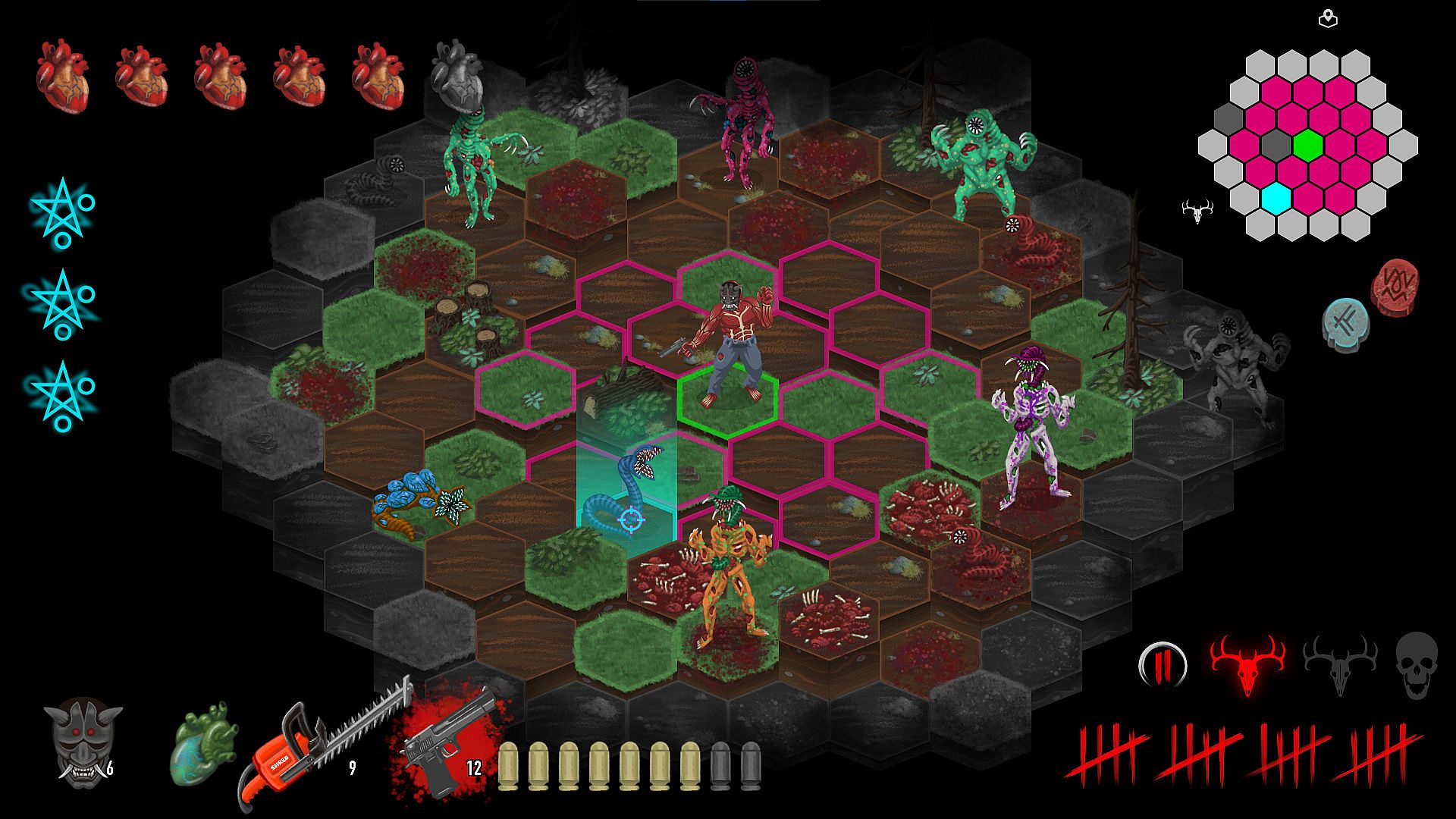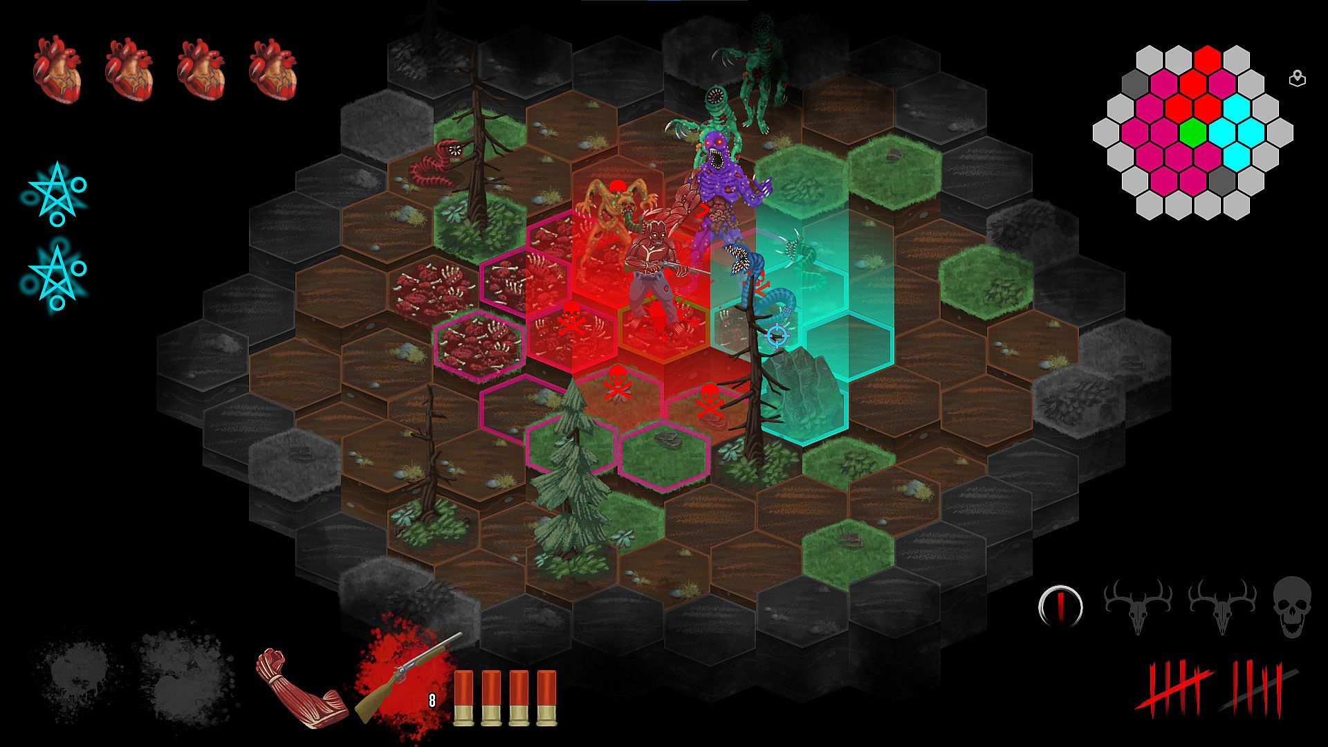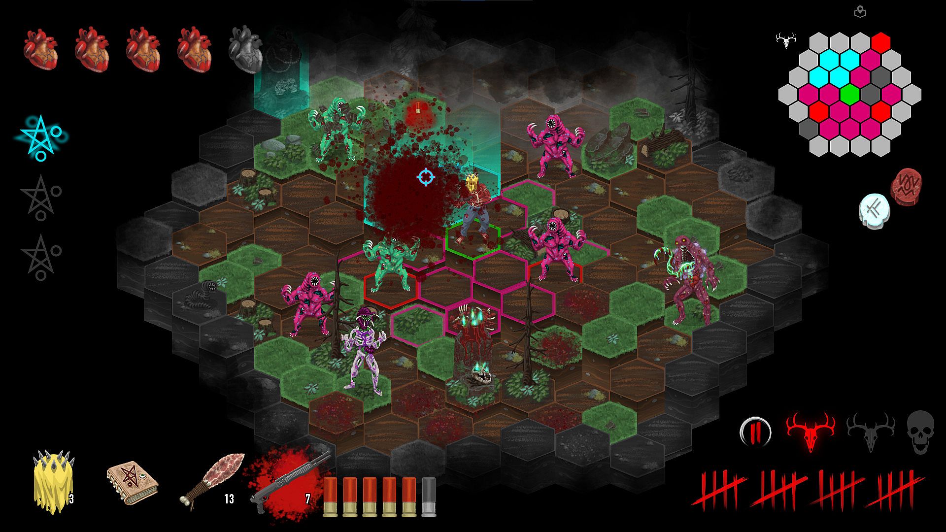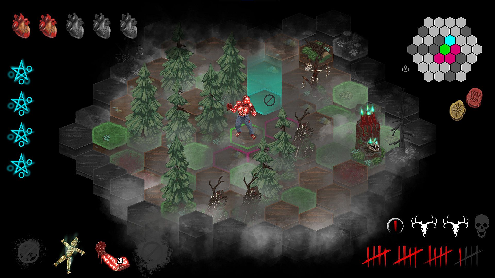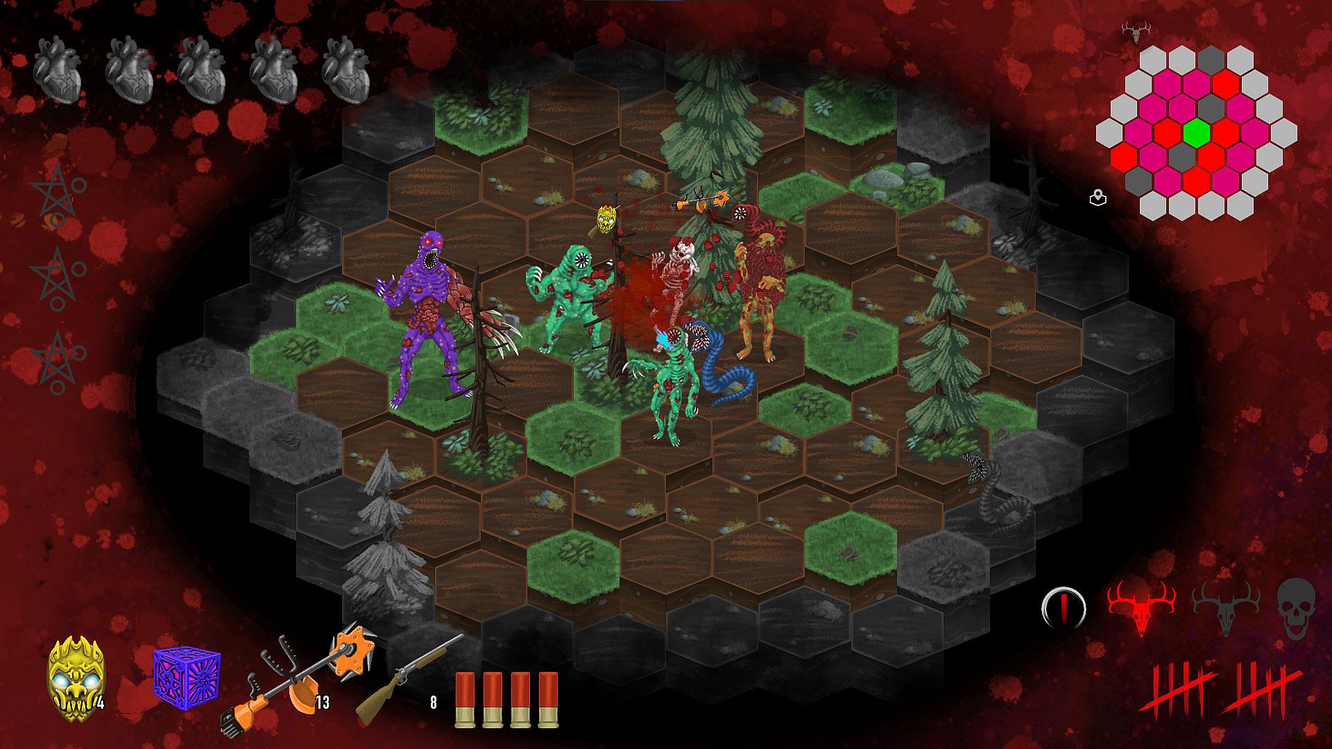 • A Turn-Based, Hex-Grid, Strategic, Difficult, Horror Roguelike where death is one misstep away. Being turn-based doesn't mean the action is slow. Commands play out as quickly as you input them. Monsters come in packs, but take their turns all at once. Nonetheless, if you want to think about your actions carefully, you have all the time in the world. Death is very patient and a painful Reconstitution is just a click away.
