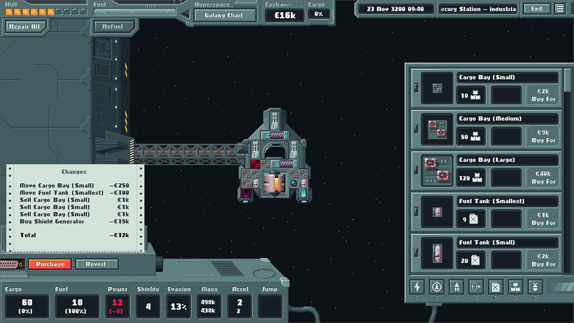 Upgrade your starship and change its configuration to balance, attack, defence, speed, cargo capacity and jump range or buy new larger starships