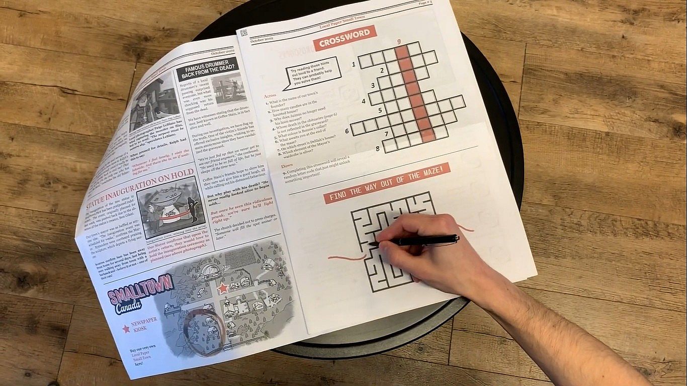 One player explores the town in VR, solving puzzles by moving cardboard cutout characters around, entering codes, and working with the second player to fill in their newspaper crossword puzzle and deducing each character's story and place in the game world. The second player, equipped with the PDF of the Smalltown newspaper, reads and scans pages for clues that may help both players advance the game state by solving puzzles in VR thanks to their shared understanding of the characters, similar to a collaborative escape room, but with more narrative flavouring.