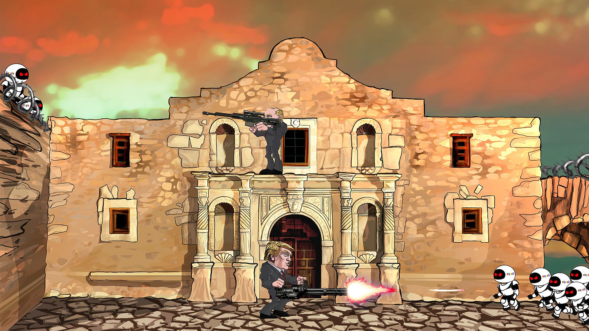 Trump and Putin will take on wave after wave of globalist robots in various locations around the world including the White House, the Alamo, and Moscow. They'll need to utilize the weapons available to them (handguns, M4, Minigun, and Sniper Rifle) to deal with hundreds of enemies.